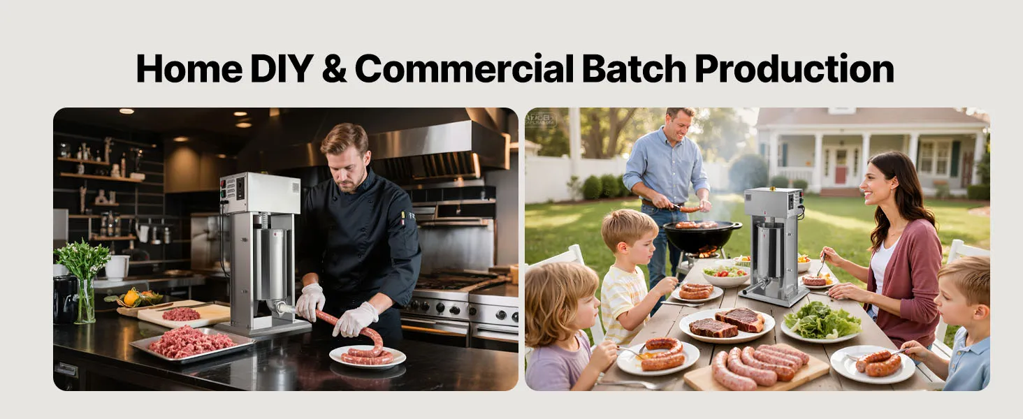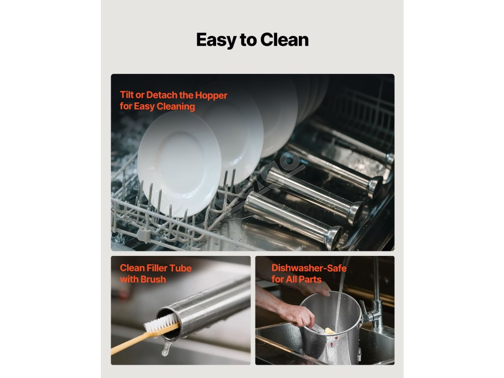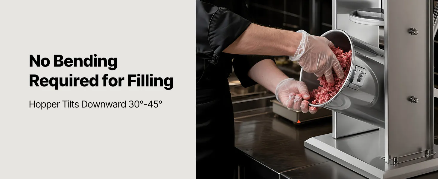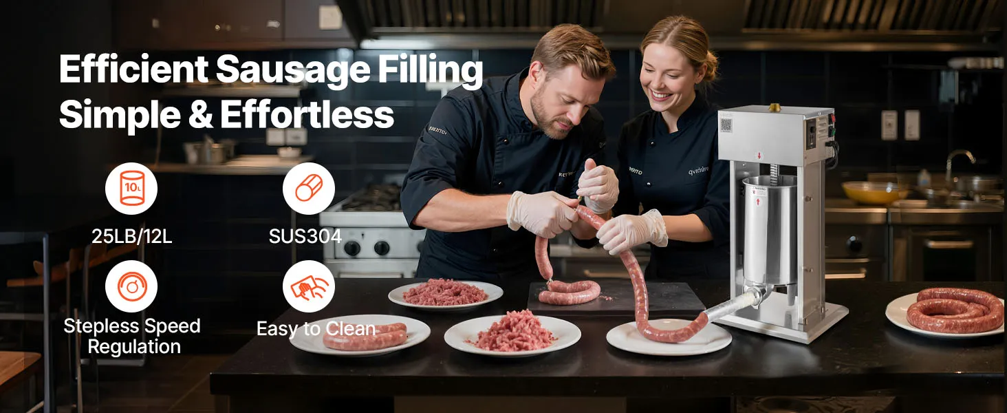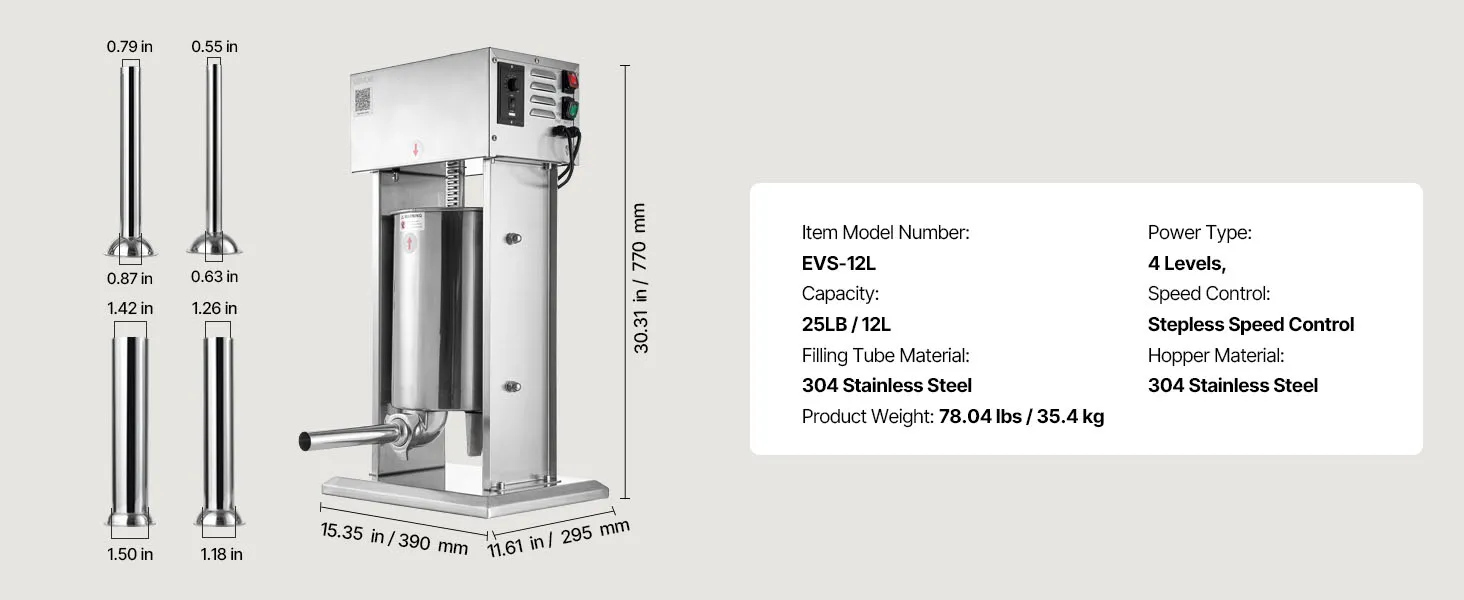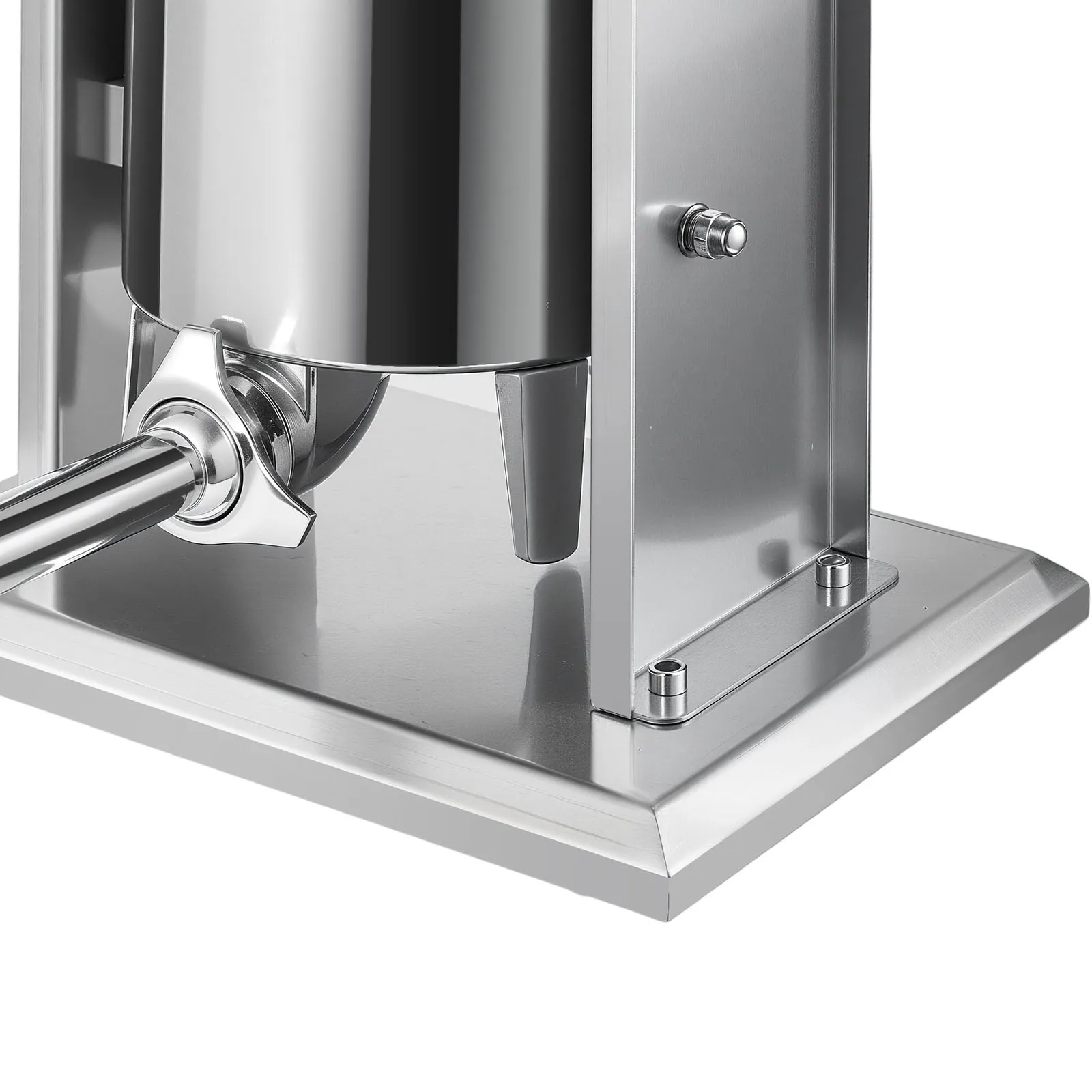Táto elektrická plnička klobás je vybavená vylepšenou prítlačnou doskou s výfukovými otvormi pre pevnejšie klobásy s nízkym obsahom bublín. Plynulá regulácia otáčok zvyšuje účinnosť a jeho veľká kapacita 25 lbs / 12 l je ideálna pre reštaurácie, supermarkety a iné komerčné zariadenia.