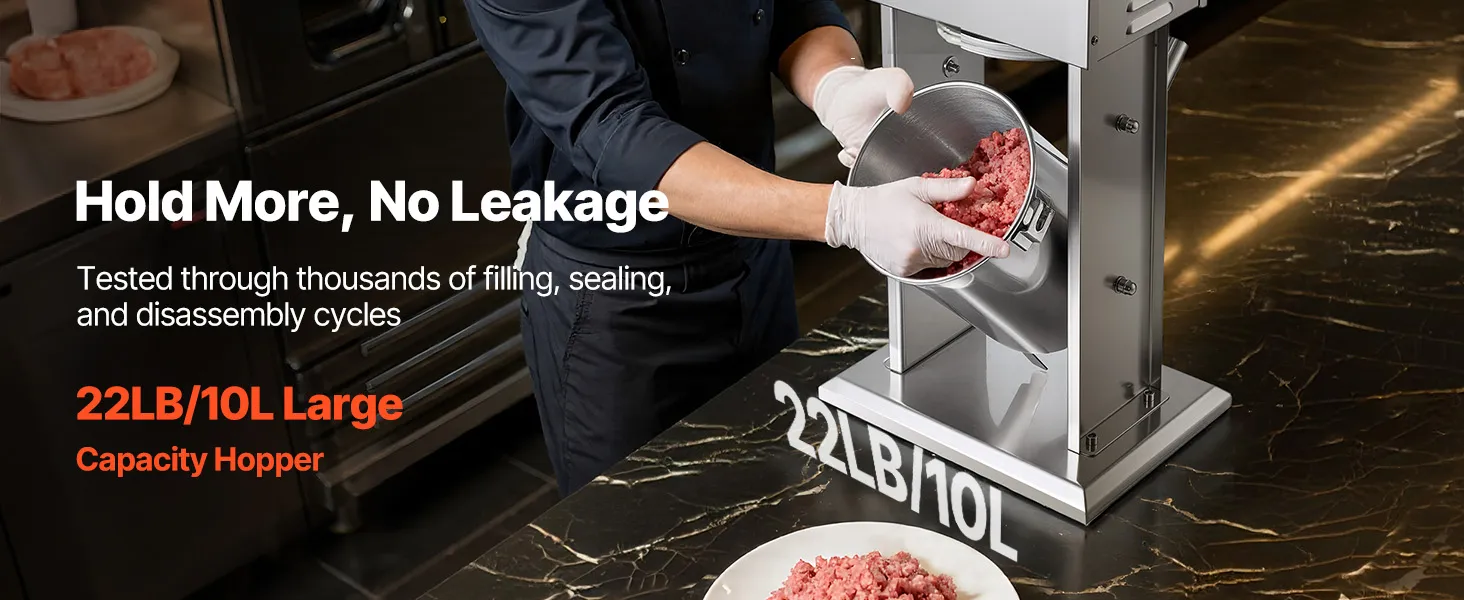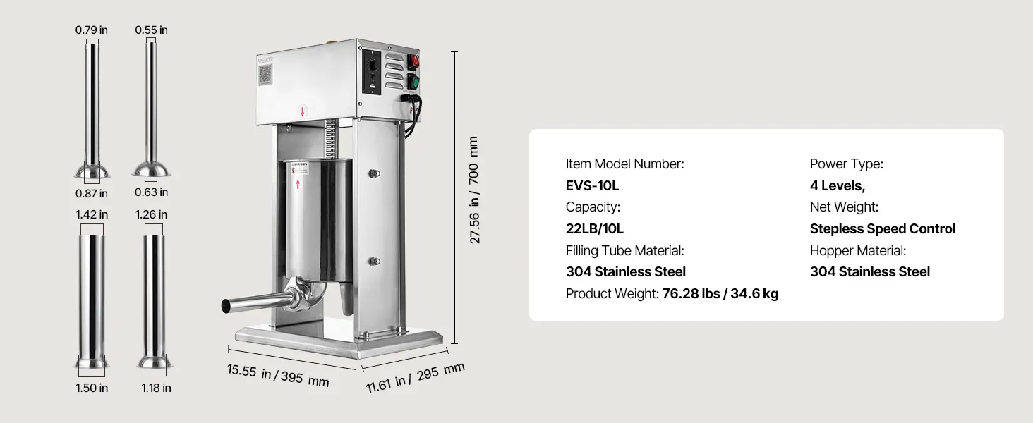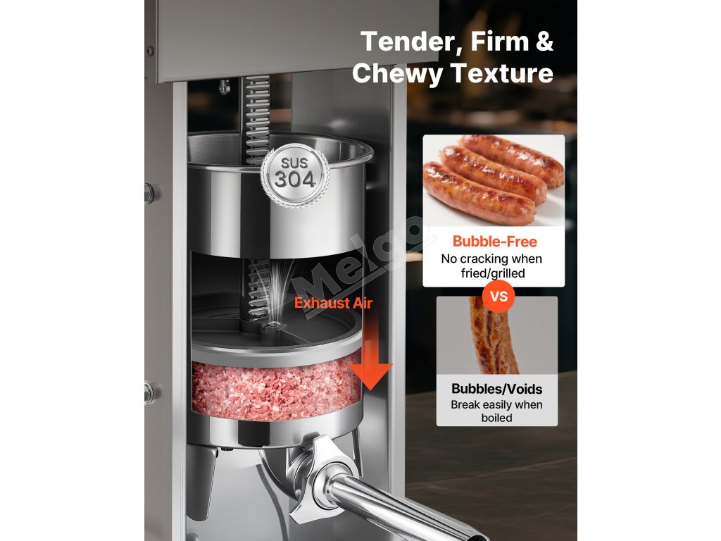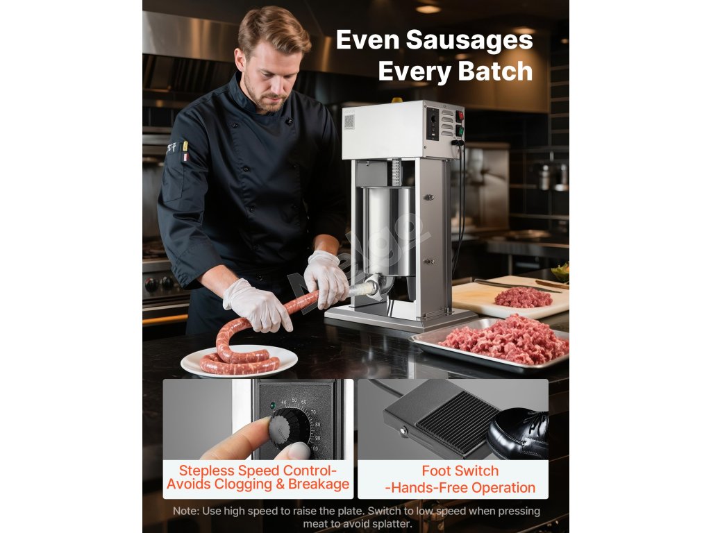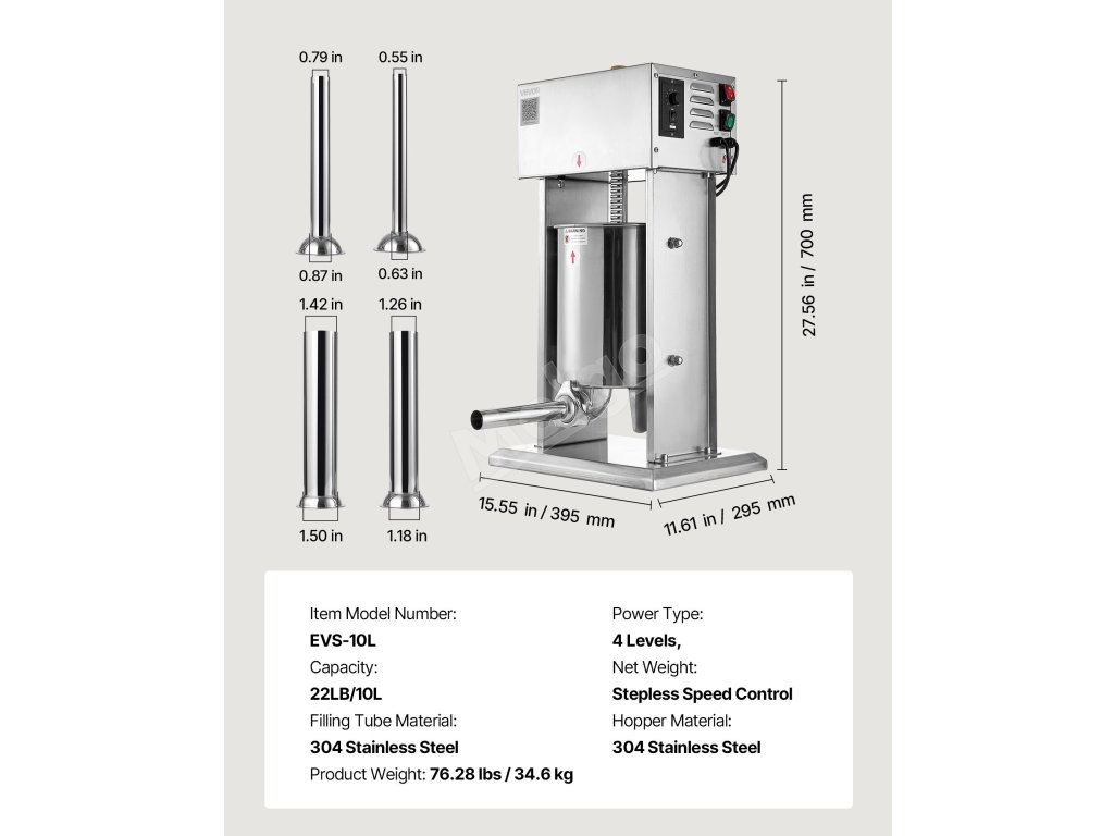 Táto elektrická plnička klobás je vybavená vylepšenou prítlačnou doskou s výfukovými otvormi pre pevnejšie klobásy s nízkym obsahom bublín. Plynulá regulácia otáčok zvyšuje účinnosť a jeho veľká kapacita 22 libier / 10 l je ideálna pre reštaurácie, supermarkety a iné komerčné zariadenia.