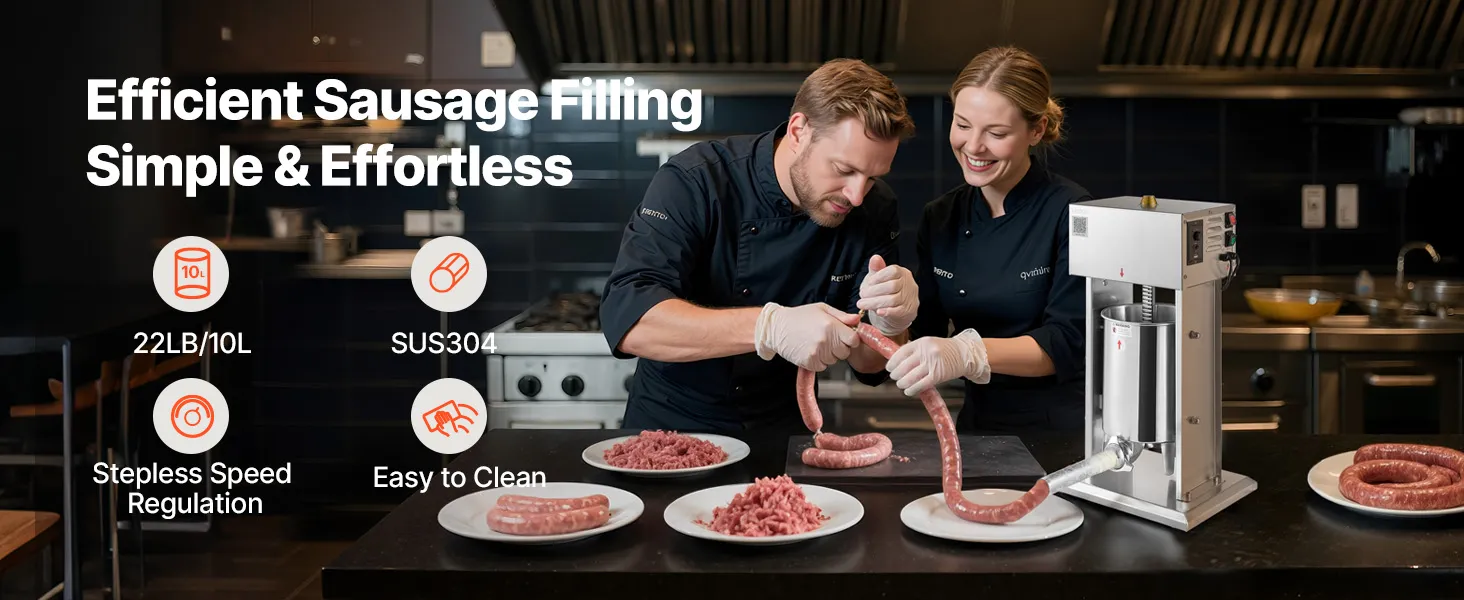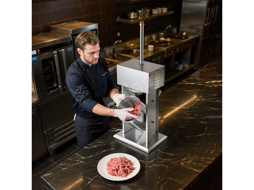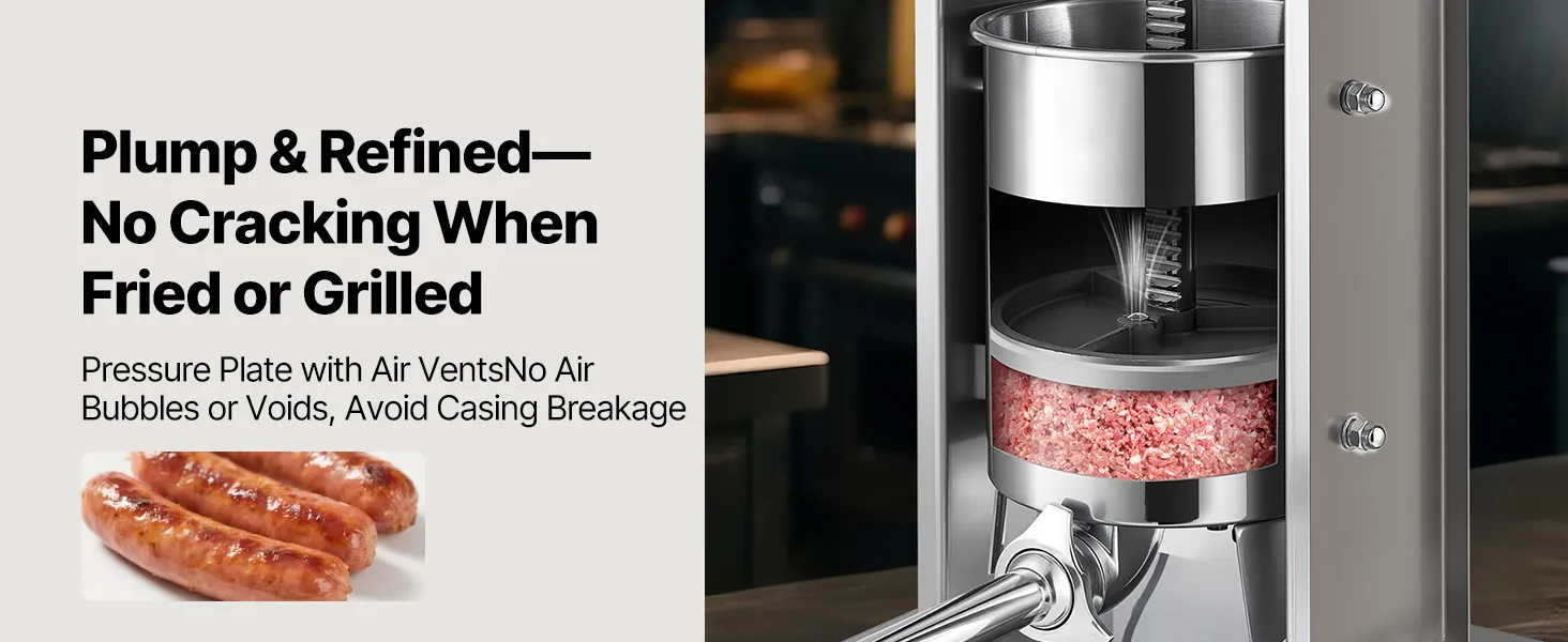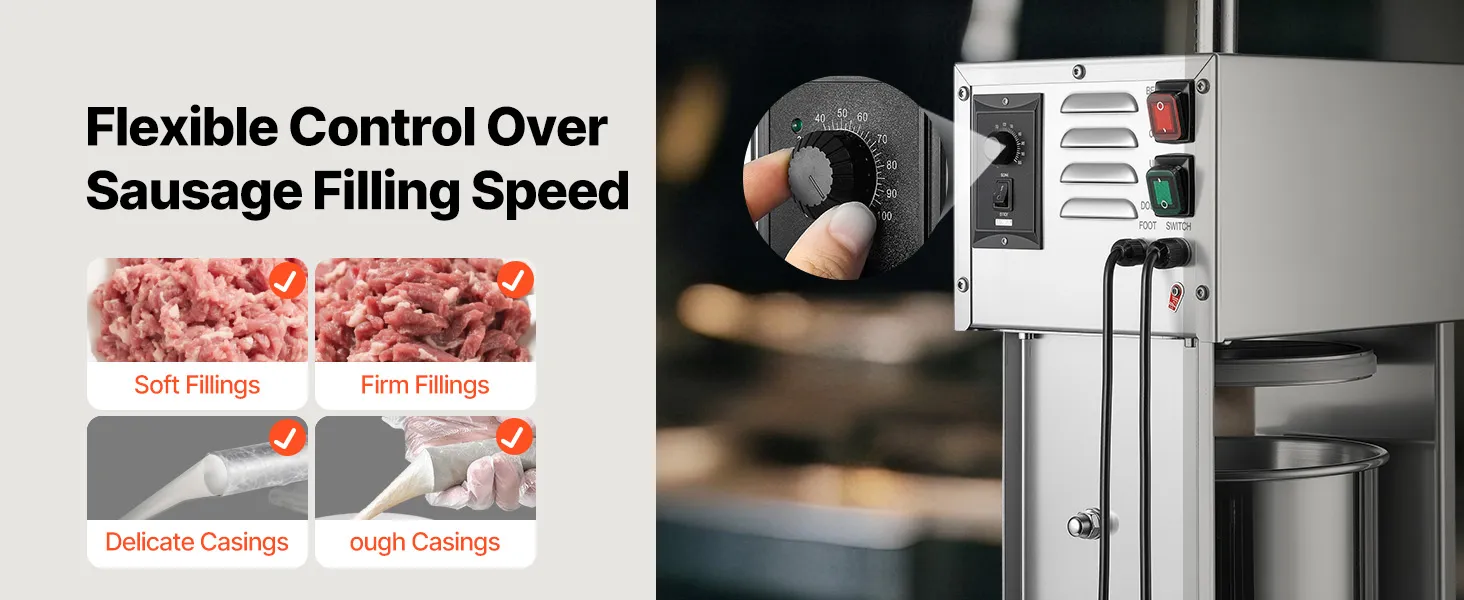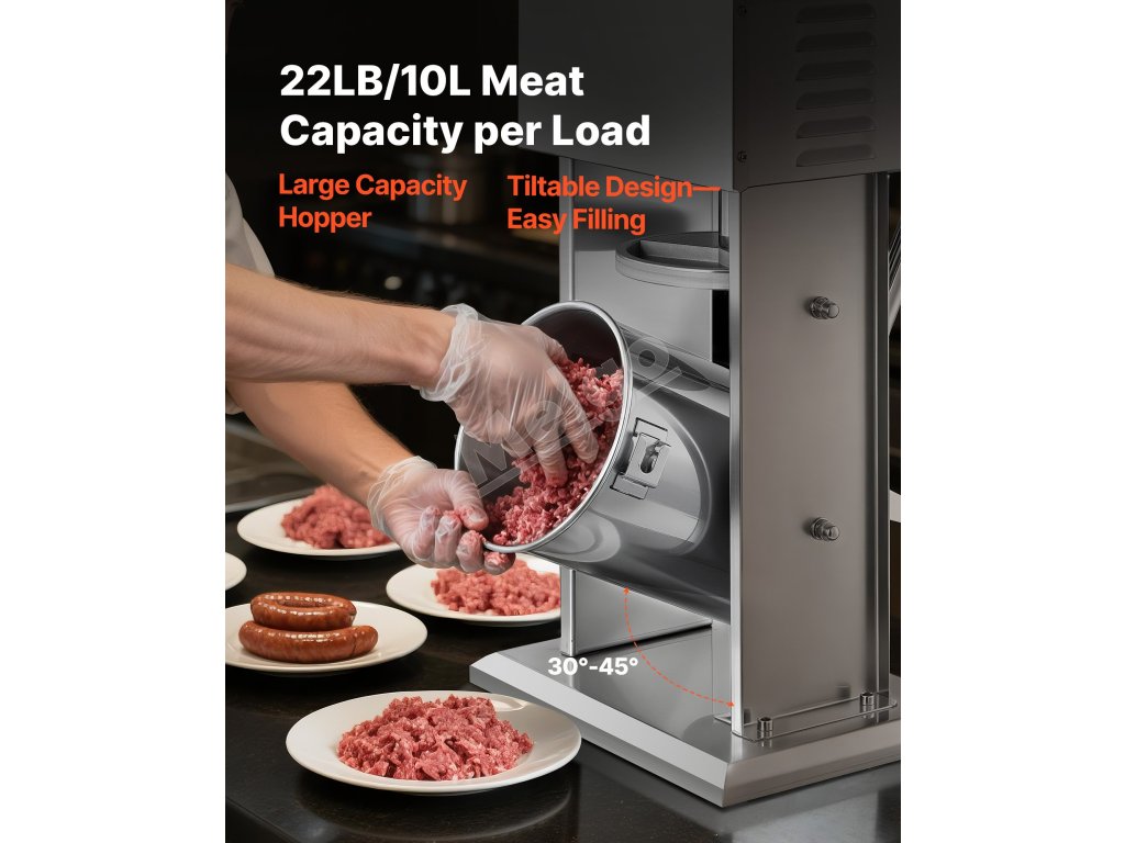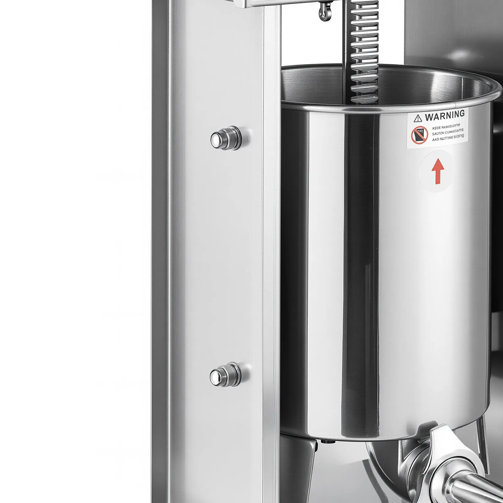 Táto elektrická plnička klobás je vybavená vylepšenou prítlačnou doskou s výfukovými otvormi pre pevnejšie klobásy s nízkym obsahom bublín. Plynulá regulácia otáčok zvyšuje účinnosť a jeho veľká kapacita 22 libier / 10 l je ideálna pre reštaurácie, supermarkety a iné komerčné zariadenia.