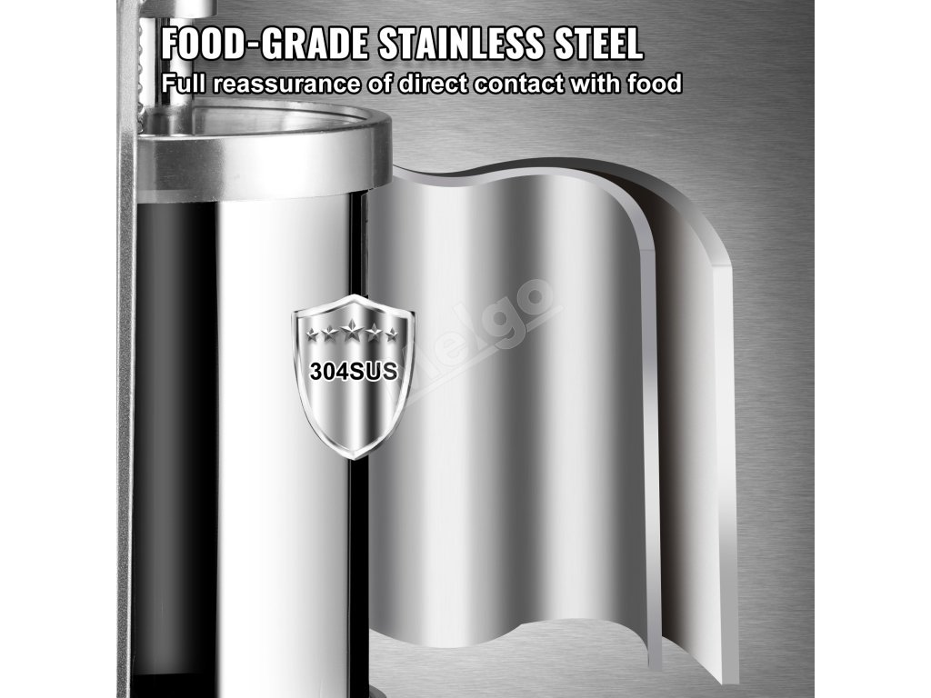 Napichovač klobás VEVOR má certifikát FDA pre bezpečnosť potravín. Môžete dôverovať kvalite a bezpečnosti tohto výrobku. Je vyrobený z odolnej nehrdzavejúcej ocele, čo zaručuje dlhodobé používanie a jednoduché čistenie po každej dávke. Vďaka používateľsky prívetivému dizajnu môžete nastaviť rýchlosť a tlak, takže je ideálny na efektívnu výrobu klobás, či už doma alebo v komerčnej kuchyni.