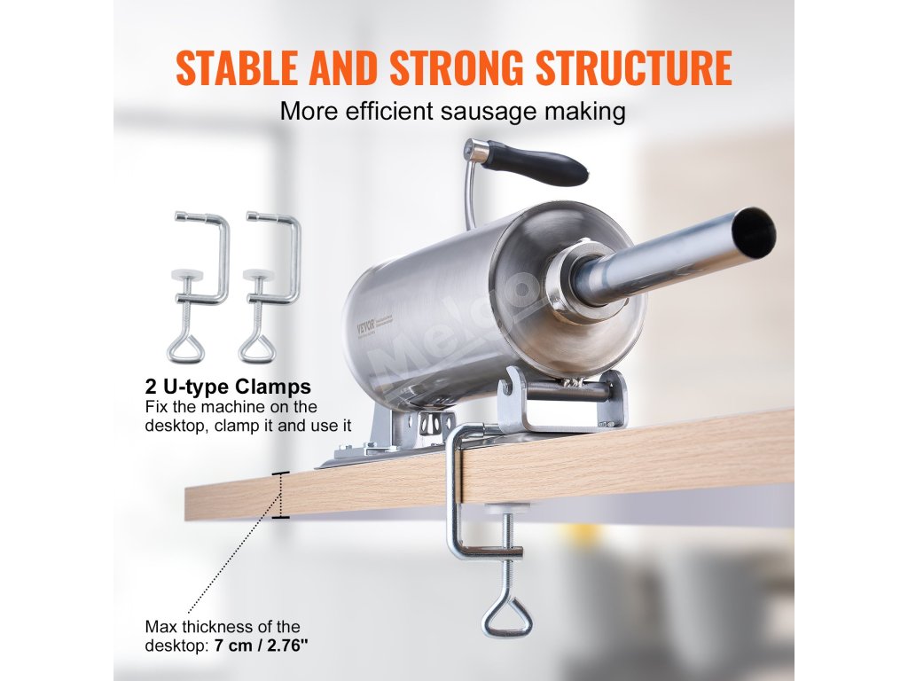 Po upnutí sa bezpečne uchytí na kuchynské stoly, čím sa zabráni skĺznutiu počas plnenia klobás, je vhodná do prevádzok s vyvýšenou plošinou a na domáce komerčné použitie.