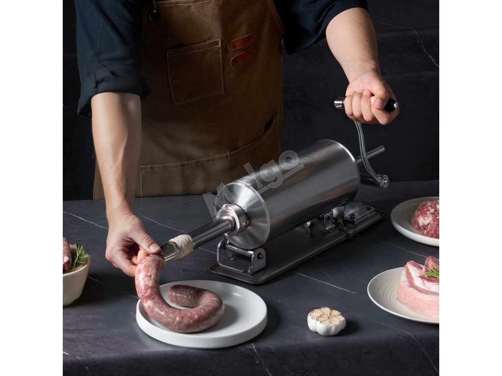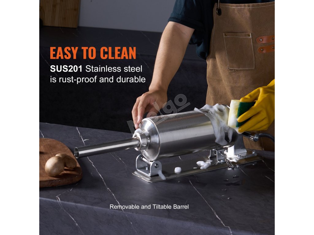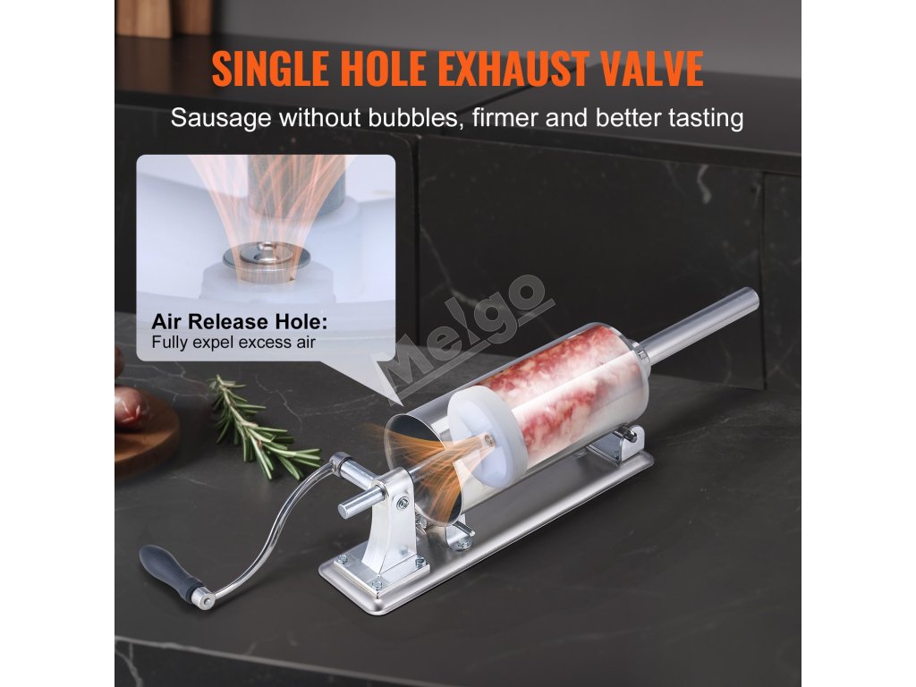 Vďaka veľkej kapacite 2,5 l / 6 libier dokáže vyrobiť viac klobás naraz. Stačí nasadiť rukoväť a začať plniť klobásy ručným zatláčaním, vďaka čomu je proces jednoduchý, nenáročný a rýchly.