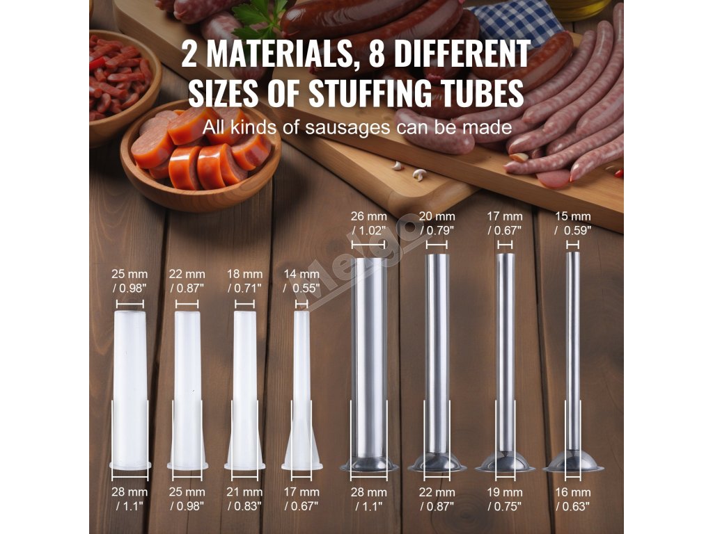 Obsahuje 8 rúrok na klobásy s rôznym priemerom na výrobu klobás rôznych veľkostí, vhodných na použitie v kuchyniach, baroch a reštauráciách.