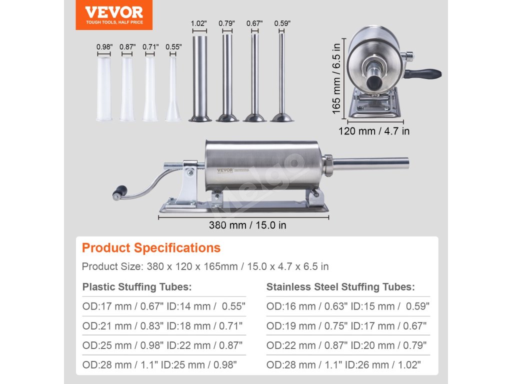 Plnička klobás VEVOR umožňuje jednoducho pridať mäsovú náplň, stlačiť a otočiť rukoväťou na výrobu klobás. Je vyrobený z potravinárskej nehrdzavejúcej ocele, dodáva sa s 2 materiálmi a 8 rôznymi veľkosťami plniacich rúrok, vhodný na výrobu rôznych druhov klobás, ideálny na domáce a komerčné použitie.