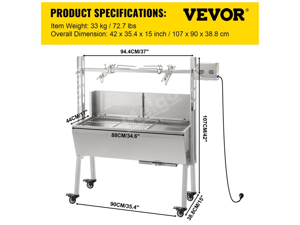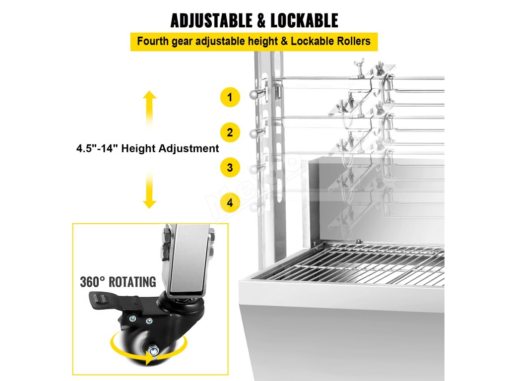 Nastaviteľná výška ražňa: 4,5"-14" (od povrchu grilu až po maximum). Štyri otvory sú určené na štyri horizontálne nastavenia výšky. Dĺžka ražňa: 37" / 94,4 cm.