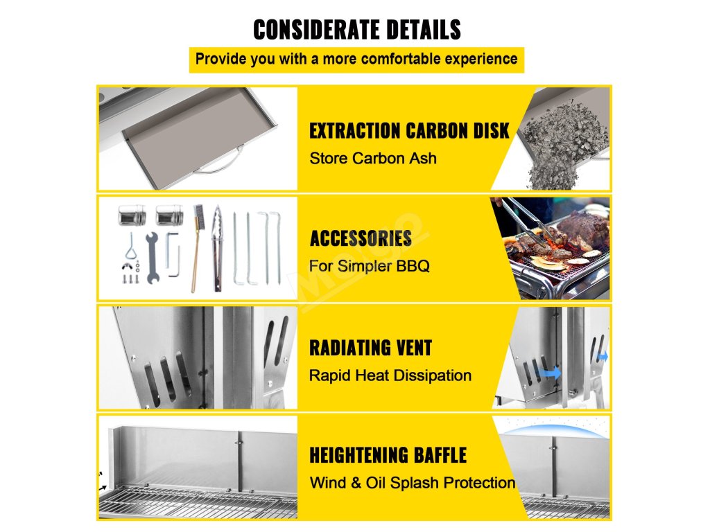Materiál z nehrdzavejúcej ocele zvyšuje tepelnú odolnosť a odolnosť proti opotrebovaniu, čo zlepšuje celkovú stabilitu a trvanlivosť. Vysokopevnostný motor vám poskytuje efektívny základ grilu.