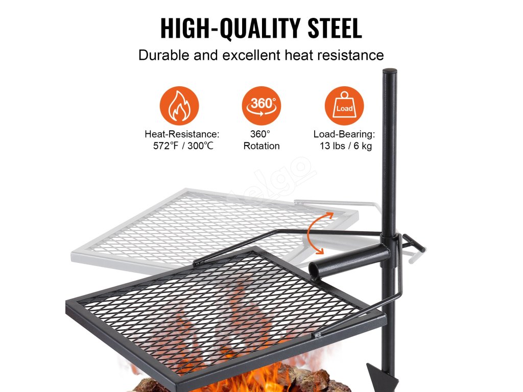Grilovací rošt na ohnisko je vyrobený z ocele vysokej tvrdosti so super odolnosťou proti opotrebovaniu, trvanlivosťou a spoľahlivým výkonom.