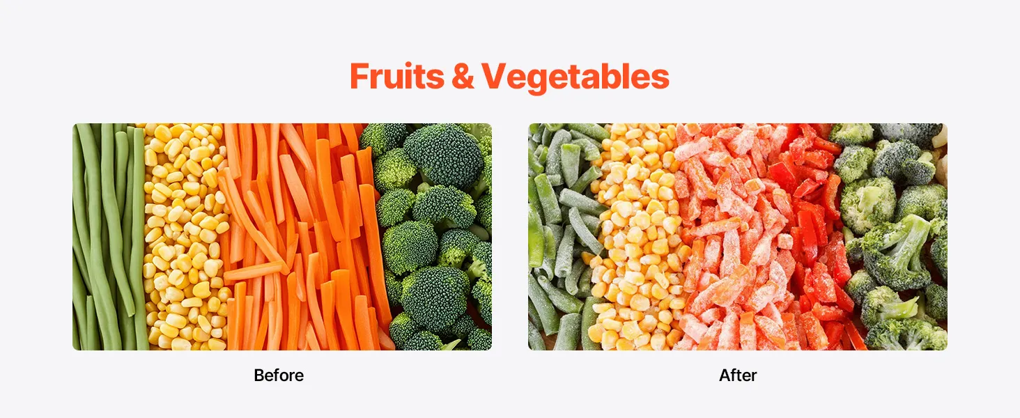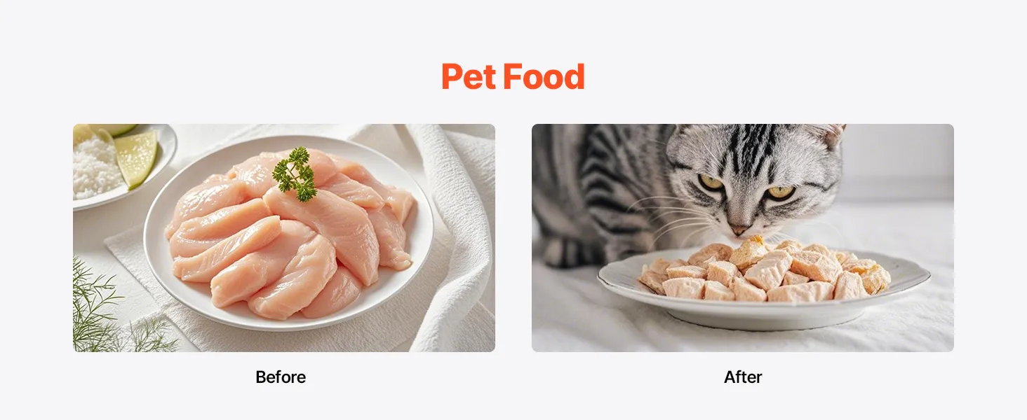 Lyofilizácia je vhodná na sušenie ovocia, zeleniny, obilia, mäsa, kvetinového čaju, krmiva pre domáce zvieratá a ďalších potravín. Tento stroj na lyofilizáciu sa vo veľkej miere používa v potravinárskom priemysle, v oblasti výživových doplnkov a vonkajších potravín.
