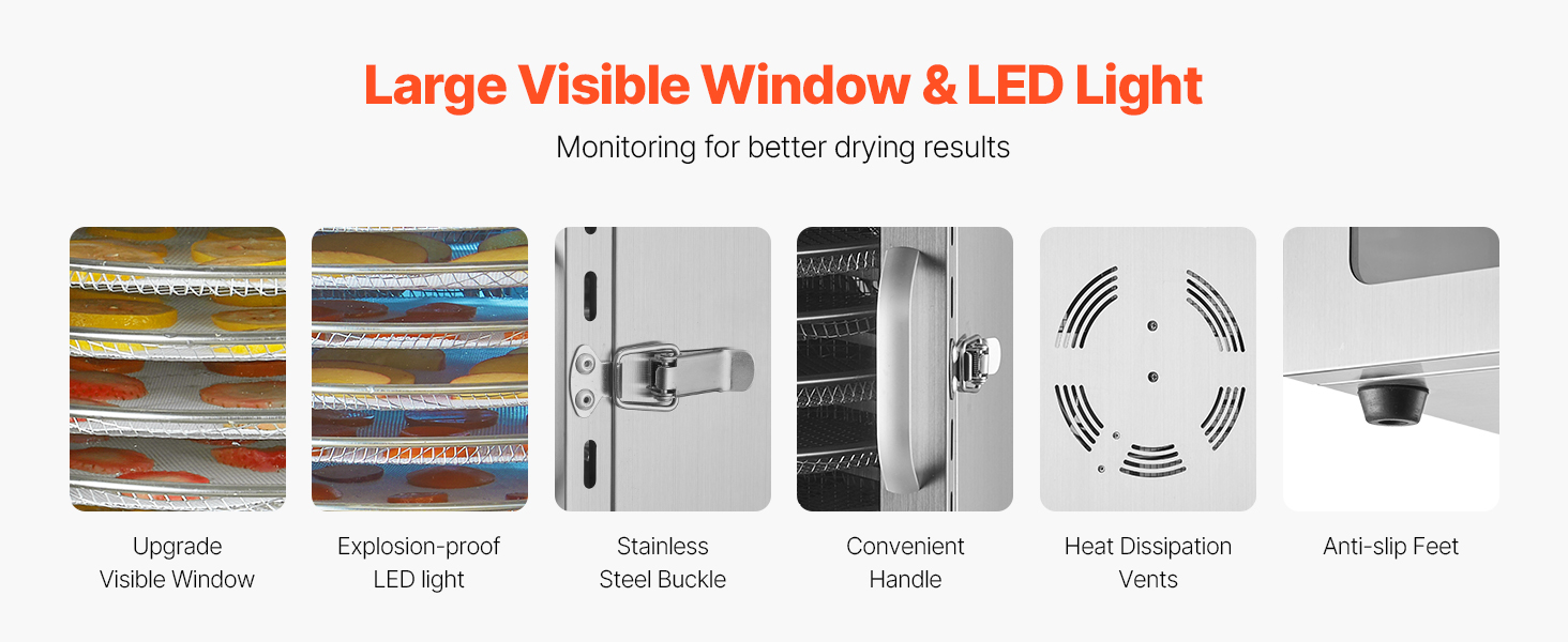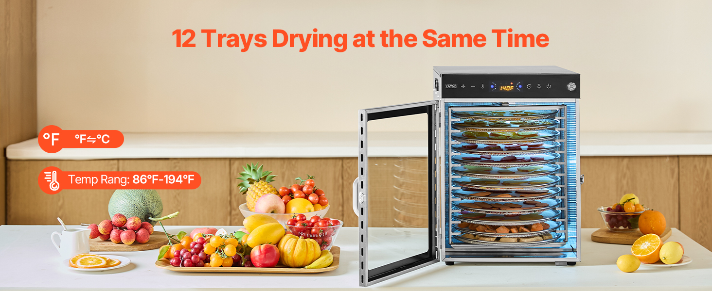 Vďaka kapacite 12 vrstiev je tento veľký sušič stroj ideálny na sušenie rôznych surovín vrátane ovocia, zeleniny, sušeného mäsa, byliniek, morských plodov, obilnín a ďalších. Dodáva sa aj s receptom, čo vám umožní ľahko pripraviť rôzne zdravé, domáce sušené potraviny.