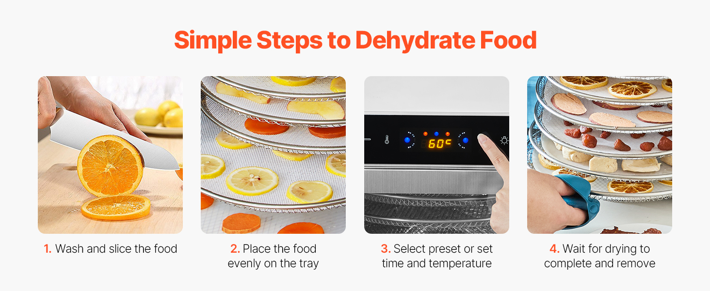 Proces dehydratácie a sušenia potravín je veľmi jednoduchý. Odporúča sa vyberať ovocie a zeleninu s bohatou dužinou a pred sušením starostlivo vyberať najlepšie suroviny a odstrániť všetky pokazené, prezreté alebo nezrelé.