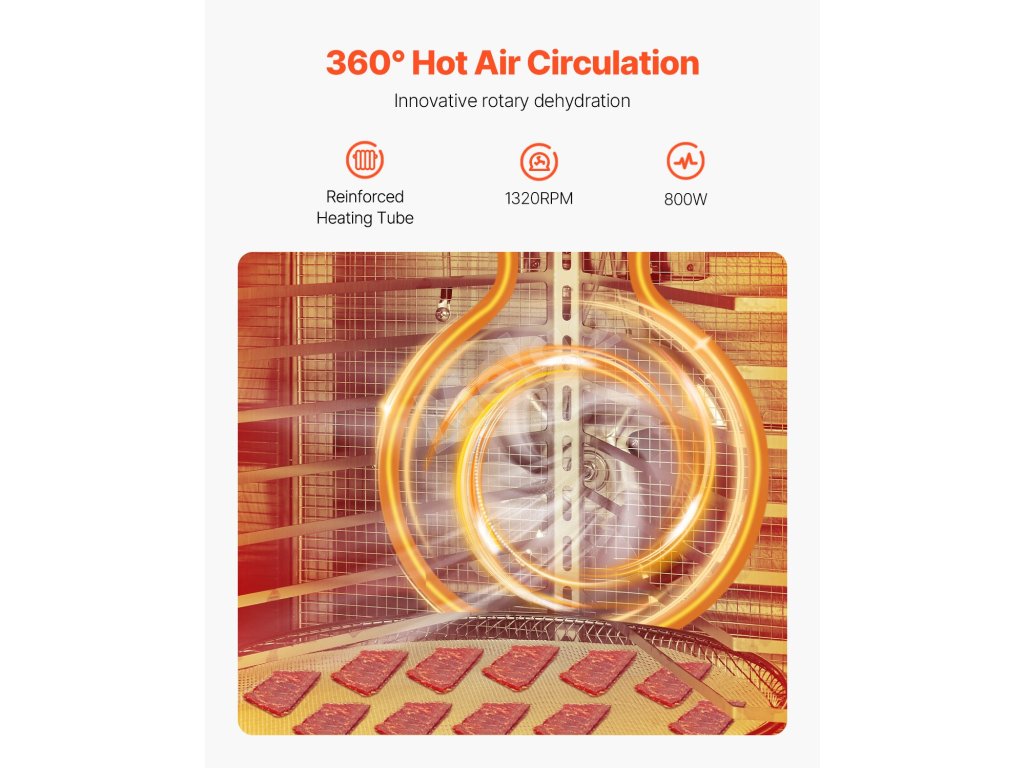 Tento dehydrátor potravín s ventilátorom a 360° otáčavou dehydratáciou suší potraviny rýchlejšie a efektívnejšie a zároveň zabraňuje miestnemu prehriatiu. Je energeticky úsporný a šetrí čas.