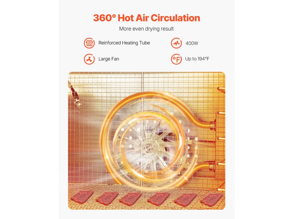 Systém cirkulácie horúceho vzduchu v našom dehydrátori potravín napodobňuje prirodzené prúdenie vzduchu a rýchlo odparuje vodu z ovocia a zeleniny bez toho, aby poškodil ich nutričné hodnoty alebo chuť.