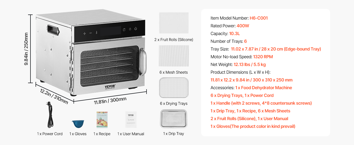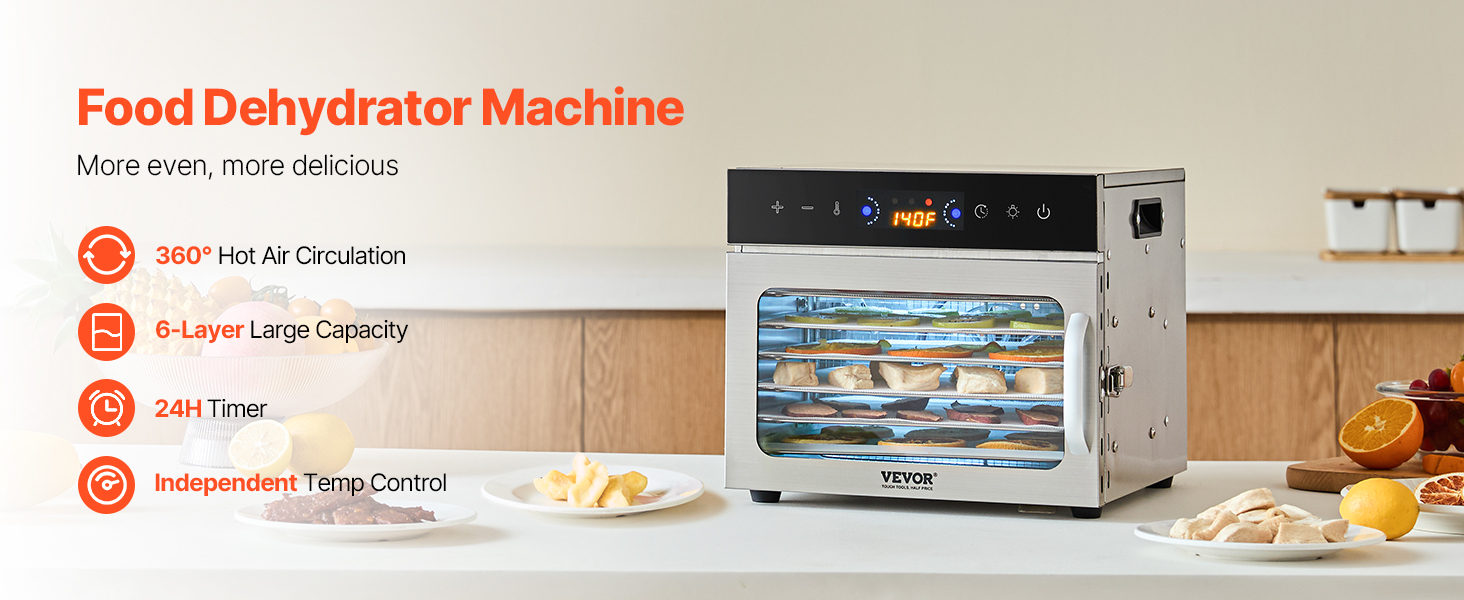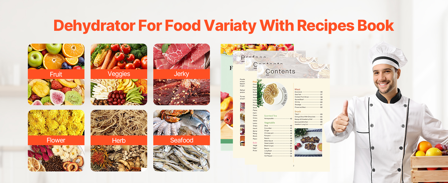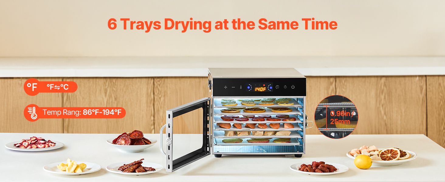 Veľký dehydrátor s kapacitou 6 vrstiev je ideálny na dehydratáciu rôznych surovín vrátane ovocia, zeleniny, sušeného mäsa, byliniek, morských plodov, obilnín a ďalších. Dodáva sa aj s receptom, čo vám umožní ľahko pripraviť rôzne zdravé, domáce sušené potraviny.
