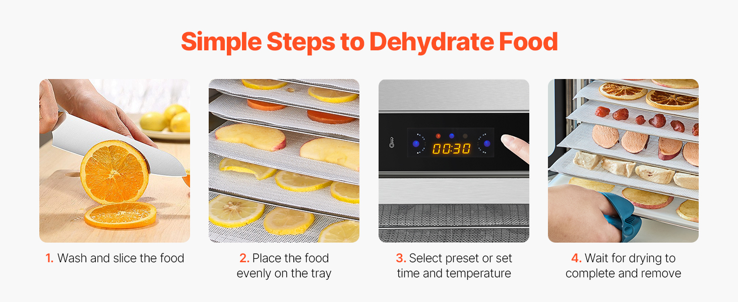 Proces dehydratácie a sušenia potravín je veľmi jednoduchý. Odporúča sa vyberať ovocie a zeleninu s bohatou dužinou a pred sušením starostlivo vyberať najlepšie suroviny a odstrániť všetky pokazené, prezreté alebo nezrelé.