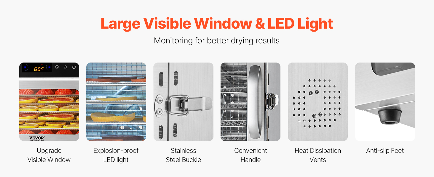 Proces sušenia sledujte pomocou viditeľného okienka a podľa potreby upravte teplotu, aby ste dosiahli lepšie výsledky sušenia. Vďaka nášmu sušičke na sušené mäso majte neustále prehľad o stave sušenia.