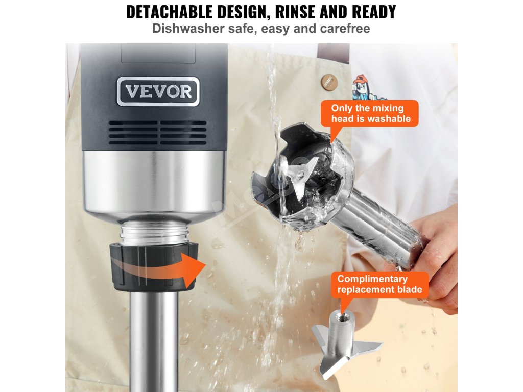 Tyčový mixér má odnímateľnú konštrukciu. Rukoväť, mixovací nôž a ďalšie príslušenstvo môžete ľahko zostaviť a rozobrať. Jeho dobre utesnená konštrukcia účinne zabraňuje vzniku zvyškov potravín vo vnútri hriadeľa. Mixovací nôž možno vložiť do umývačky riadu na pohodlné čistenie.