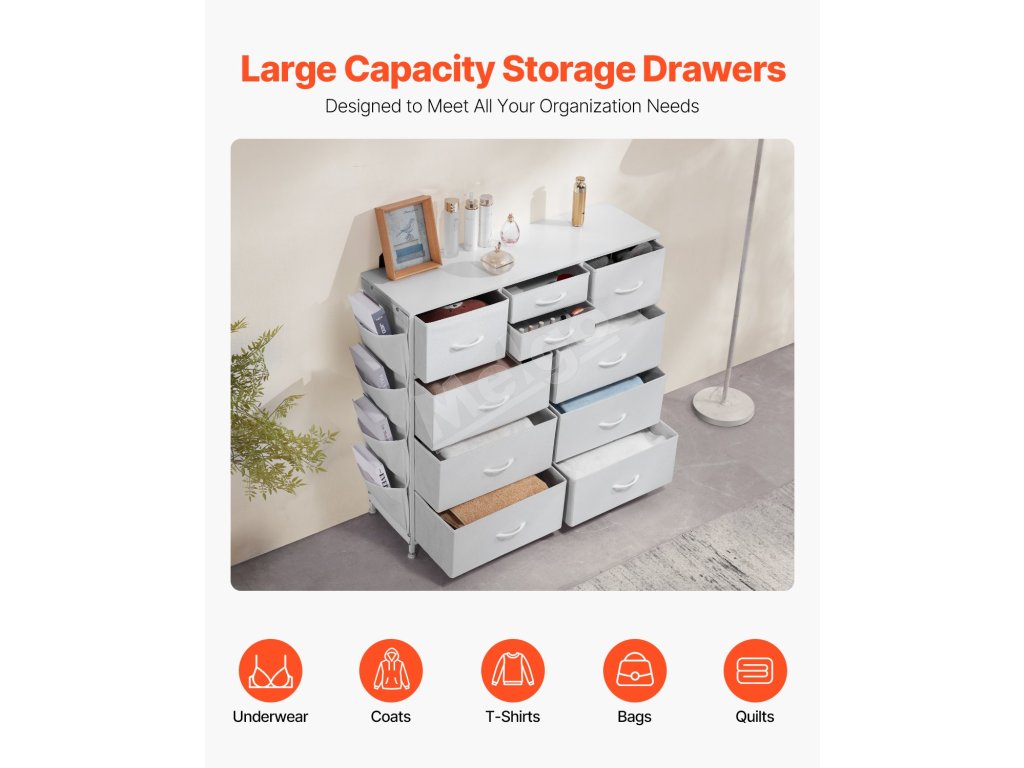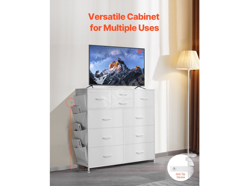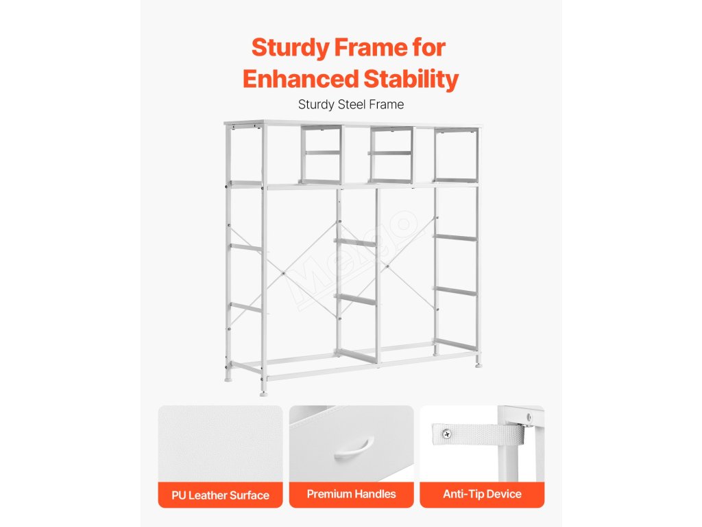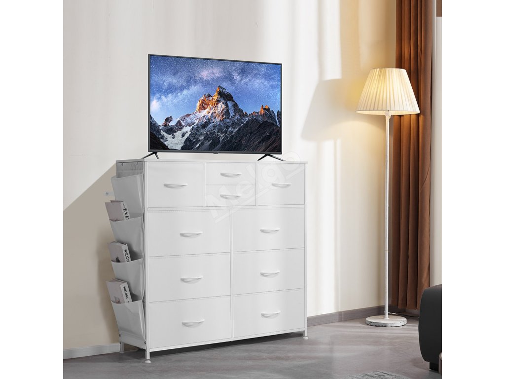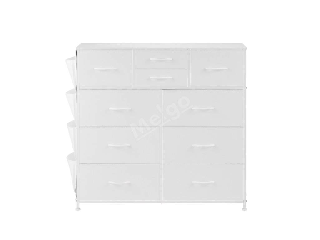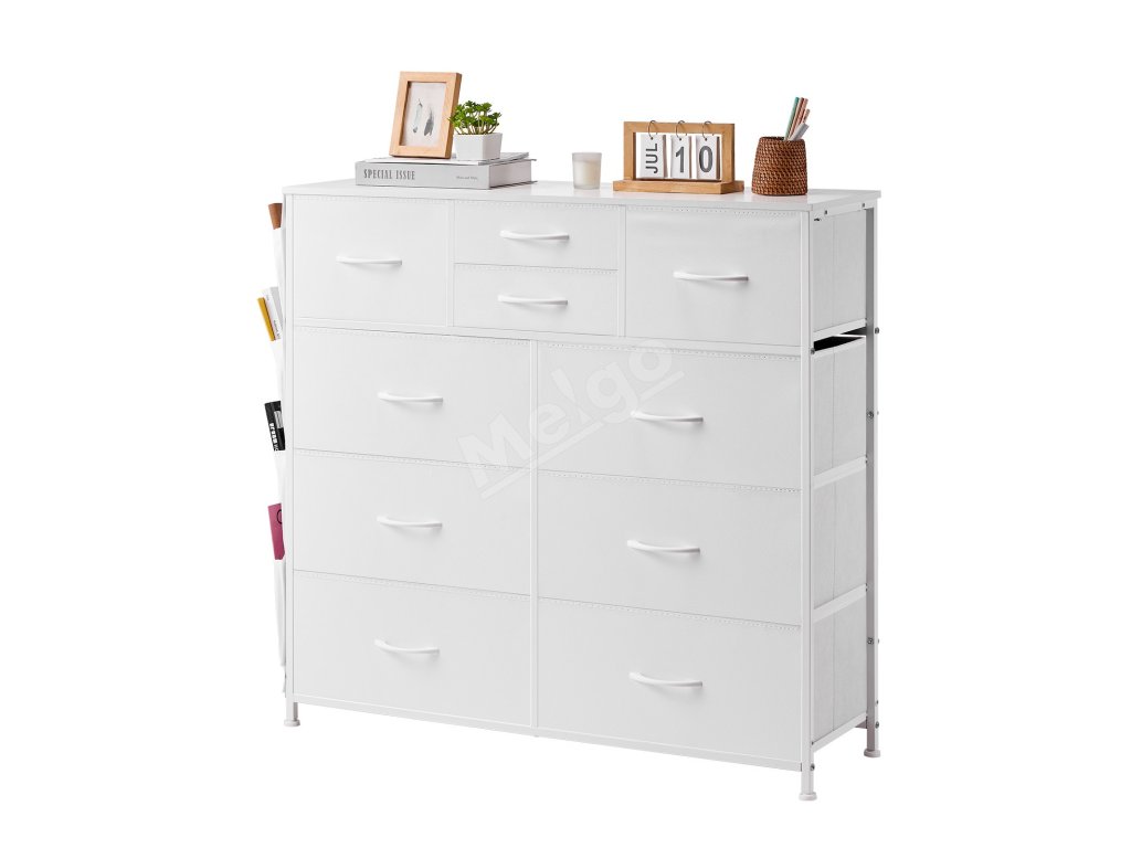 Komoda s 10 látkovými zásuvkami, oceľový rám, madlo, biela, na spálňu