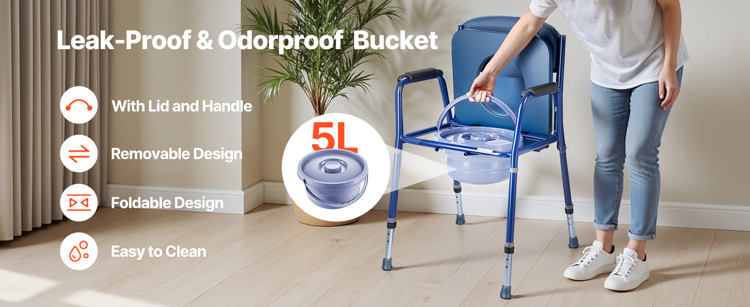 Súčasťou nášho nočníka pre dospelých je odnímateľné 5l vedro s vekom, ktoré zabraňuje úniku a zápachu. Dá sa ľahko odpojiť a vyčistiť, čím sa komoda udržiava svieža a hygienická.