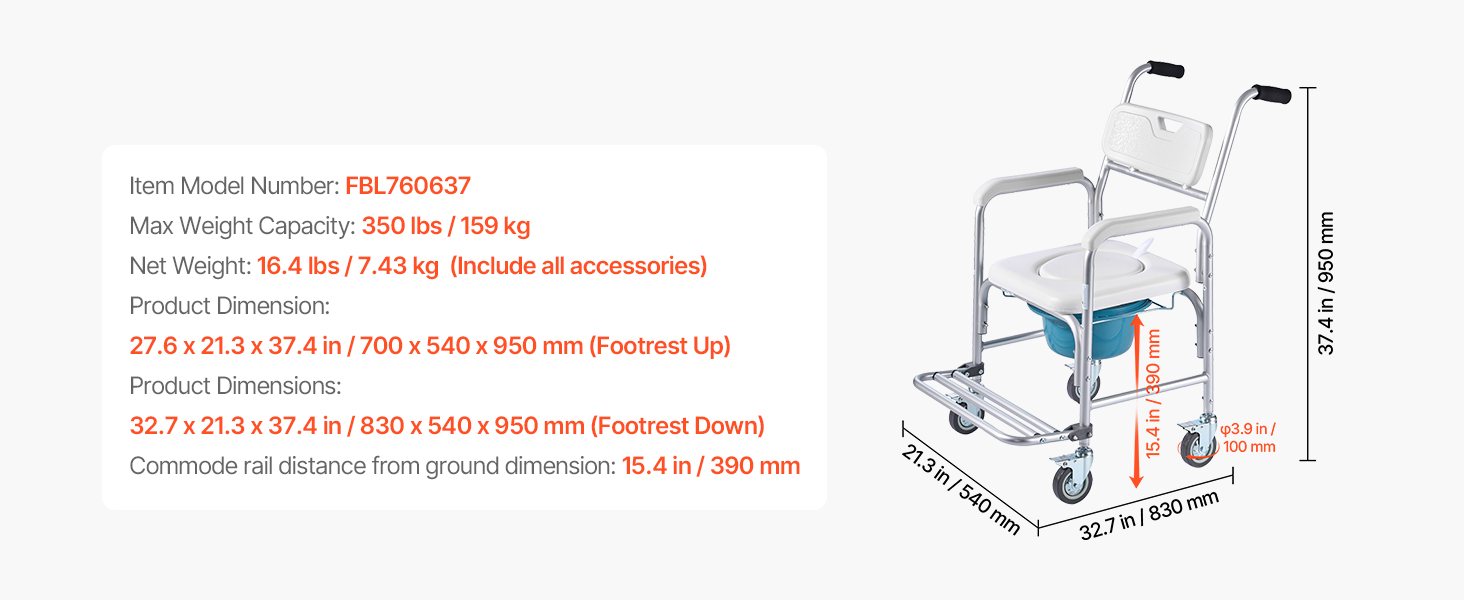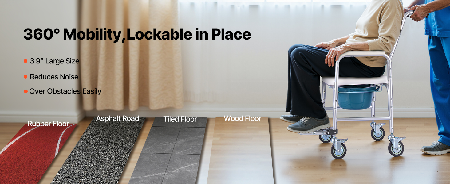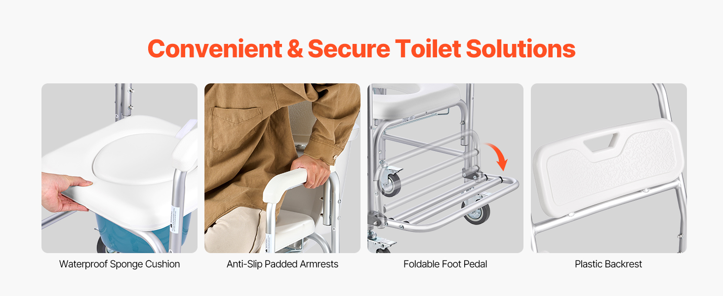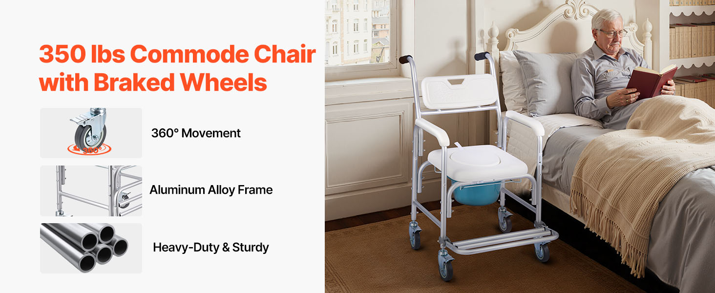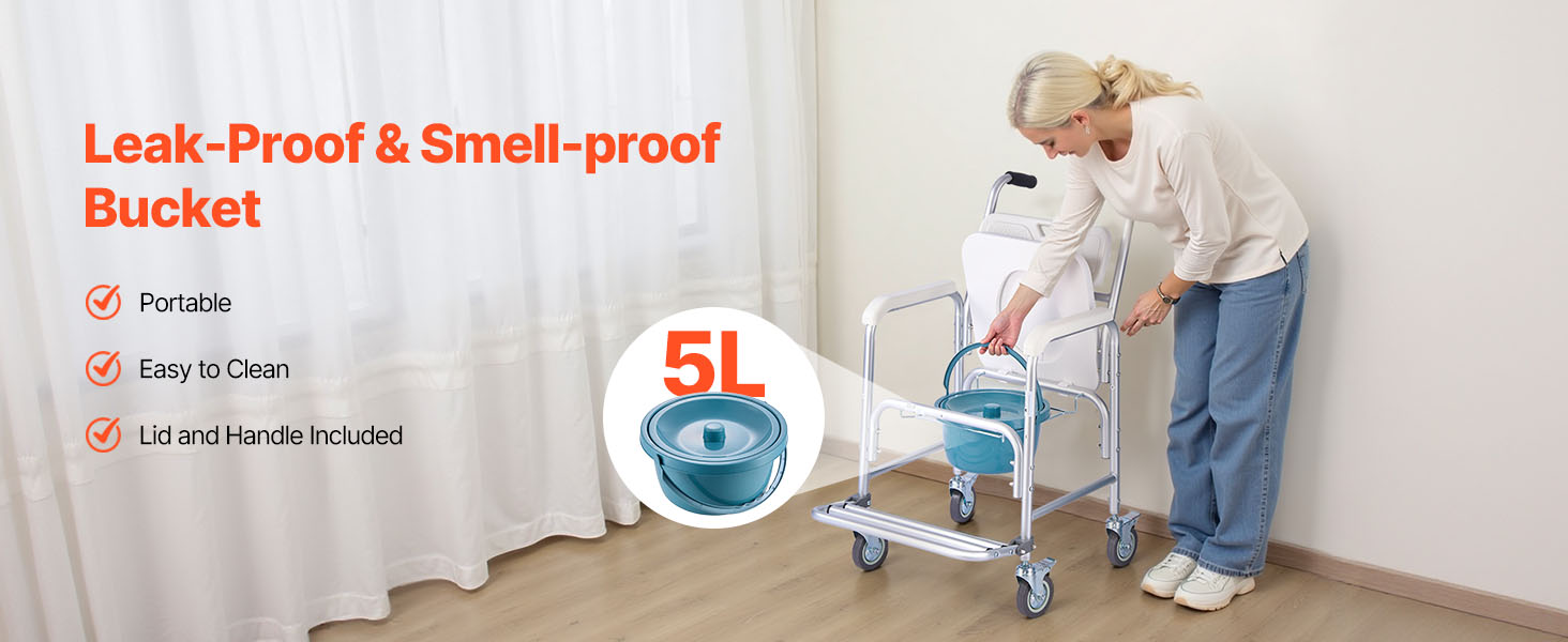 Toaletná stolička na kolieskach 159 kg, 4 v 1, odnímateľné 5L vedro