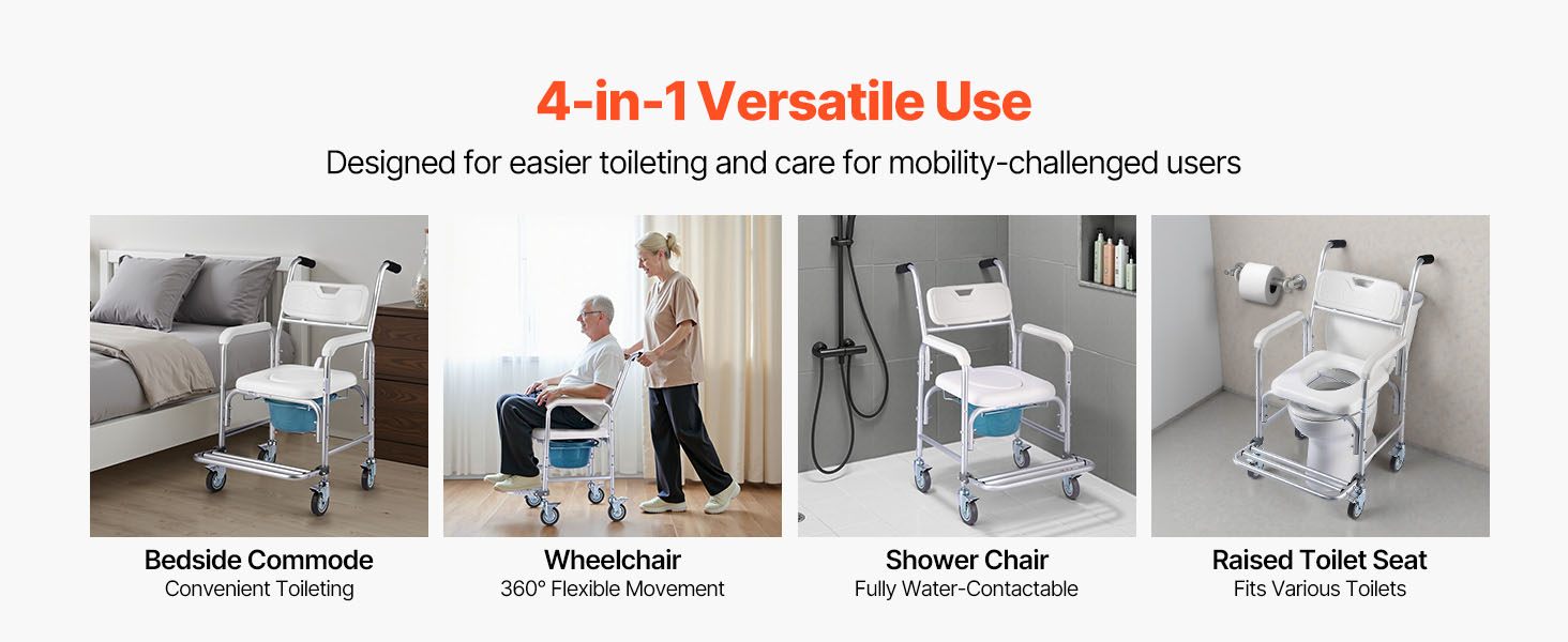 Funguje ako nočná komoda pri posteli, invalidný vozík, vyvýšené záchodové sedadlo alebo sprchovacia stolička. Spoľahlivé riešenie osobnej starostlivosti, ktoré zabezpečuje pohodlnú a dostupnú toaletu pre osoby s obmedzenou pohyblivosťou.