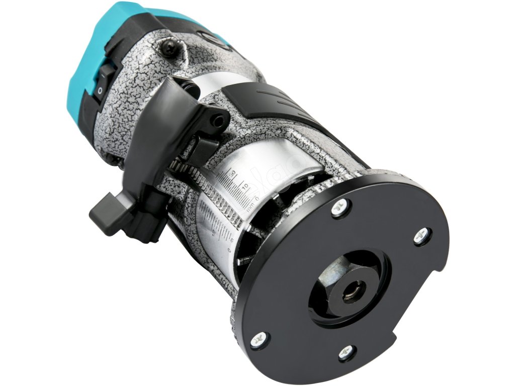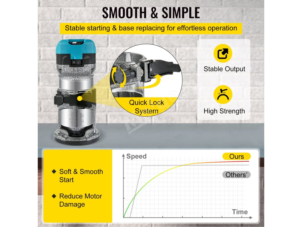 Mäkký štart spôsobuje, že otáčky motora stroja sa postupne zrýchľujú, čím sa predchádza nadprúdovému spúšťaniu a zastavuje sa skákanie tejto frézy na obrábanie dreva. Systém rýchleho uvoľnenia a uzamknutia uľahčuje nastavenie hĺbky a demontáž/inštaláciu základne.