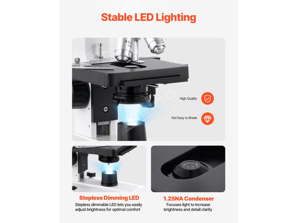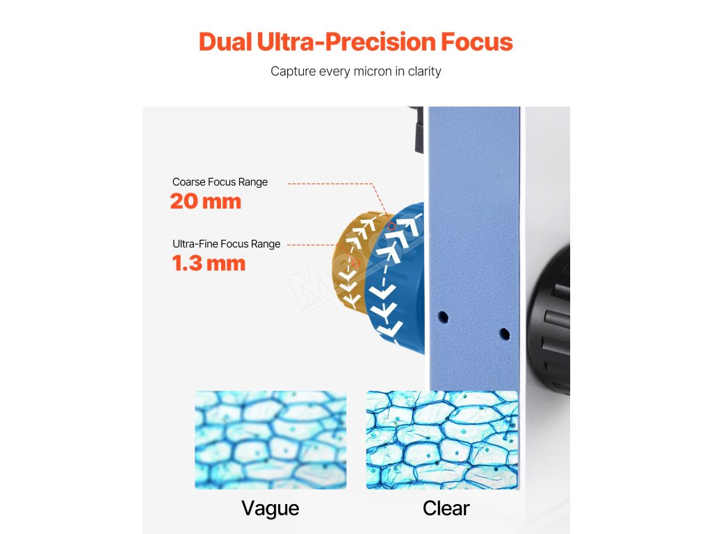 Tento mikroskop je vybavený 20 mm hrubým zaostrovaním a 1,3 mm jemným zaostrovaním v kombinácii so zdrojom svetla LED a kondenzátorom, vďaka čomu zachytí každý mikrónový detail a poskytuje úžasne jasné snímky.