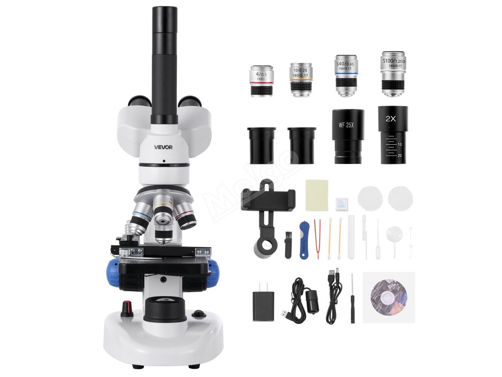 Trinokulárny mikroskop 40–5000X, hliníkové telo, led držiak na telefón