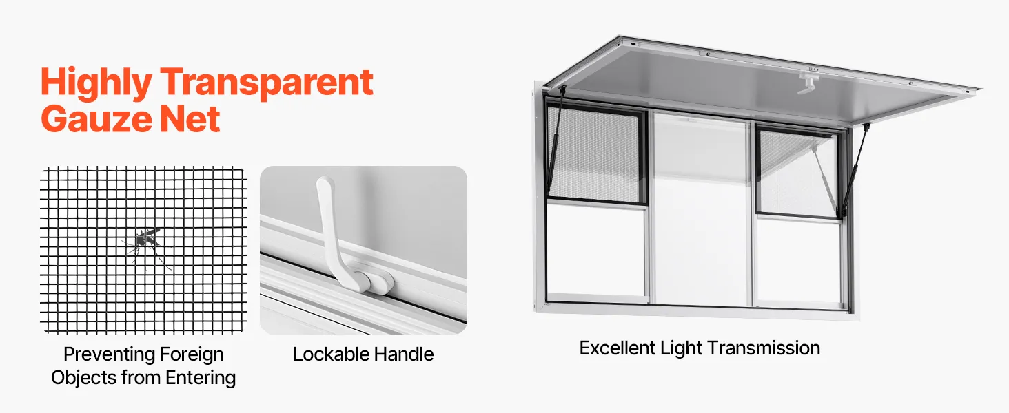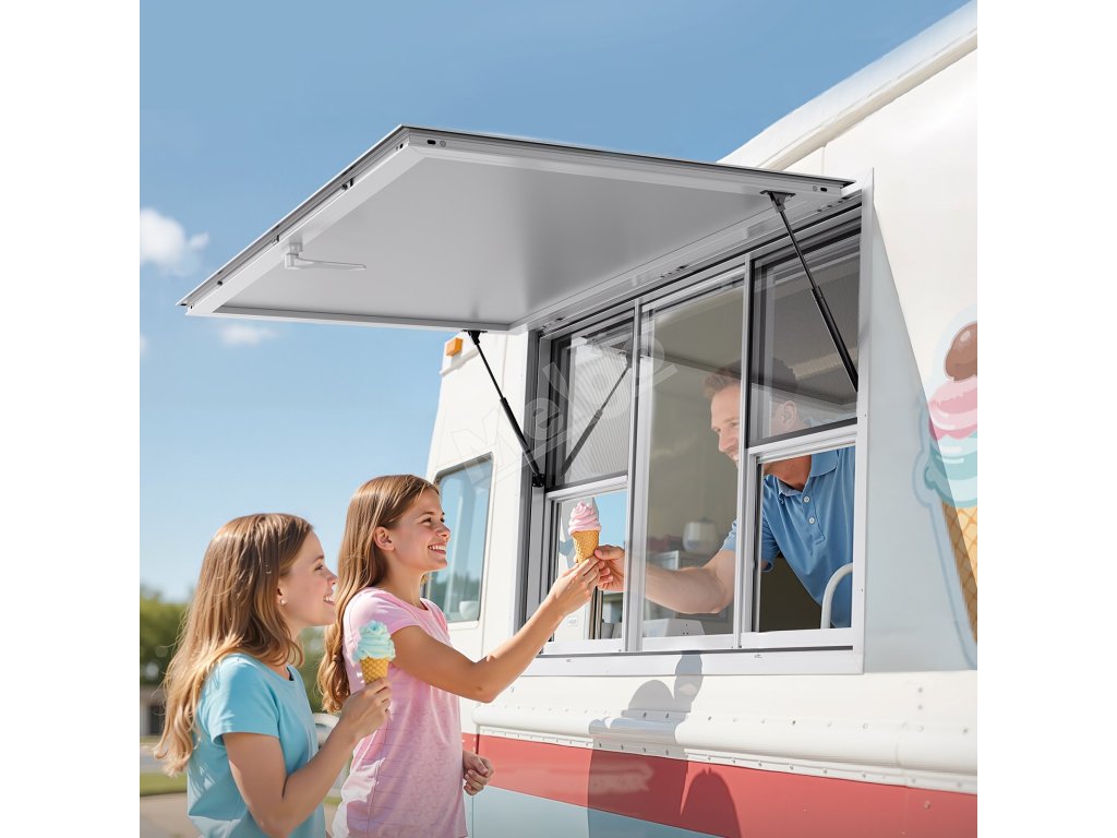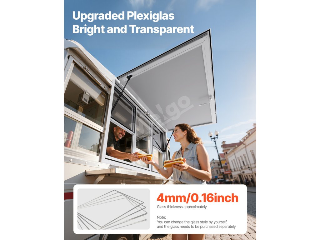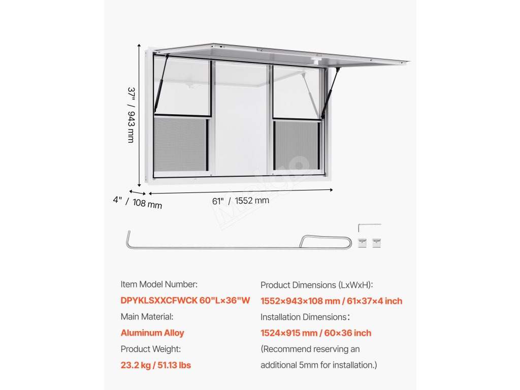 Otázka 1: Sú rozmery okna presné? Zmestí sa do môjho potravinového vozíka/pultíka?A1: Prísna kontrola rozmerov! Inštalačný rozmer rámu okna je 1524x915 mm / 60x36 palcov, vhodný pre štandardné otvory potravinového vozíka/pultíka. Pred kúpou si prosím zmerajte svoj inštalačný priestor.Q2: Je akrylát (PMMA) náchylný na praskanie alebo poškriabanie?A2: Vysoko odolný! Modernizovaný 4 mm akryl PMMA ponúka odolnosť voči nárazom vyššiu ako bežné sklo, dokáže odolať nárazom od potravinových vozíkov a náročným podmienkam, ako je vysoké teplo a olejové výpary.Q3: Dokážu hydraulické tyče stabilne podoprieť uhol otvorenia 85°?A3: Dvojité hydraulické tyče poskytujú silnú oporu! Vďaka použitiu hydraulických tyčí série 420 (zdvih 150 mm) sa okno otvára a zatvára hladko a môže zostať zavesené v akomkoľvek uhle - ideálne pre scenáre častého používania.Q4: Sú uzamykacie body náchylné na hrdzavenie?A4: Pozinkovaná antikorózna úprava! Uzamykacie body majú povrchovú úpravu zo zinkovej zliatiny a prešli 72-hodinovým testom soľnou hmlou, čím ponúkajú lepšiu odolnosť proti korózii ako bežné zámky na dlhodobé používanie v exteriéri bez obáv.Q5: Obsahuje zástenu? Ako ho môžem čistiť?A5: Navrhnuté na jednoduchú údržbu! Táto verzia obsahuje sieťku, ktorá účinne zabraňuje prenikaniu hmyzu. Povrch okna možno čistiť vlhkou handričkou. Rám má bielu práškovú povrchovú úpravu, ktorá odoláva olejovým škvrnám.