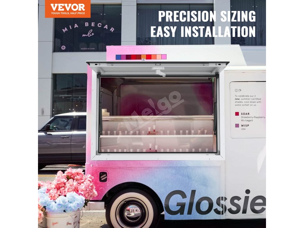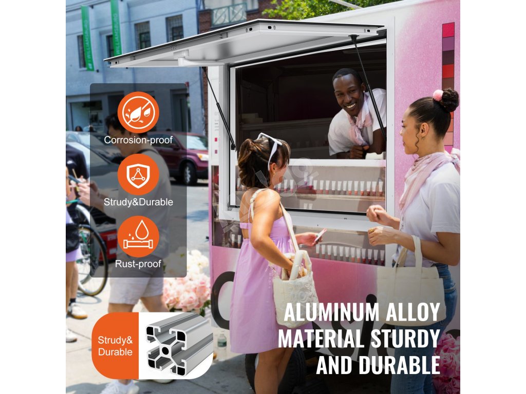 Otvára sa až do uhla 85° a ponúka široký výhľad s jednoduchým ovládaním vďaka dvom pneumatickým tyčiam a závesom. S týmto koncesným okienkom môžete bez námahy podávať zákazníkom jedlo.