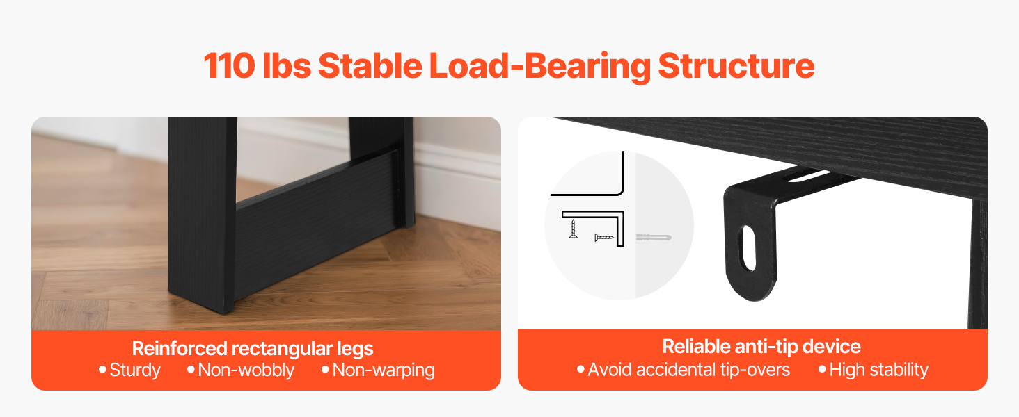 Stolík pod pohovku so zásuvkou, vyrobený so stabilnou obdĺžnikovou konštrukciou, zostáva stabilný a nekolíše sa ani pri držaní malých spotrebičov. Jeho súčasťou je aj zariadenie odolné proti prevráteniu, ktoré zvyšuje stabilitu. Pred použitím sa uistite, že ste nainštalovali zariadenie odolné proti prevráteniu.