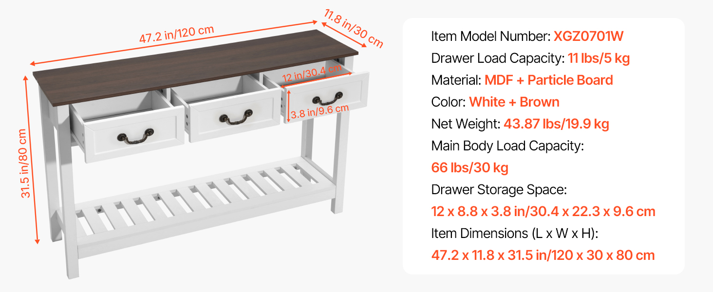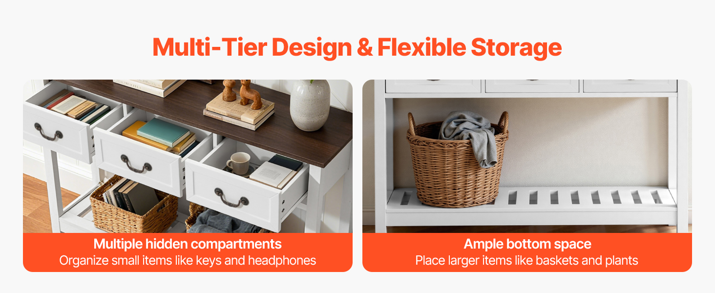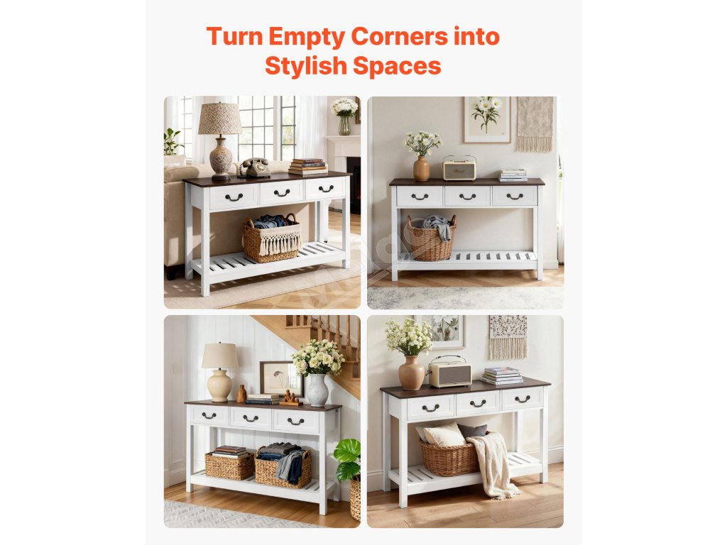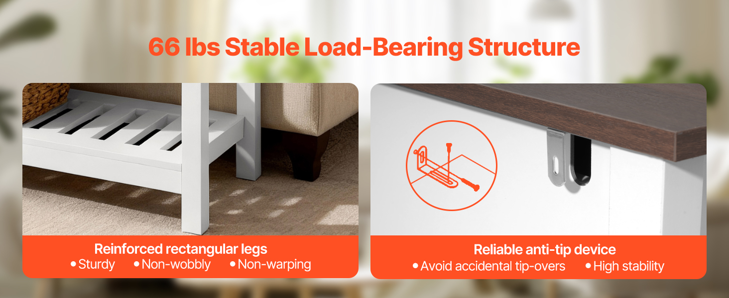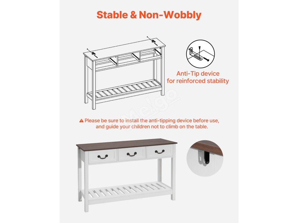 Zostavený so stabilnou obdĺžnikovou konštrukciou zostáva stolík za pohovku so zásuvkou stabilný a nekolíše sa ani pri uložení malých spotrebičov. Jeho súčasťou je aj zariadenie odolné proti prevráteniu, ktoré zvyšuje stabilitu. Pred použitím sa uistite, že ste nainštalovali zariadenie odolné proti prevráteniu.