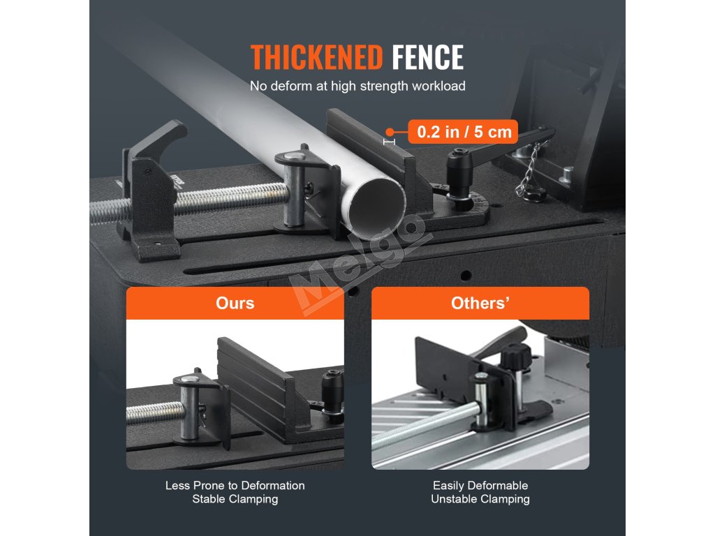 Kapacita 45-stupňového pokosu s nastaviteľným plotom umožňuje rýchle a presné pokosové rezy bez prevracania ťažkého materiálu - beznástrojové nastavenie plotu pre rôzne veľkosti materiálu.
