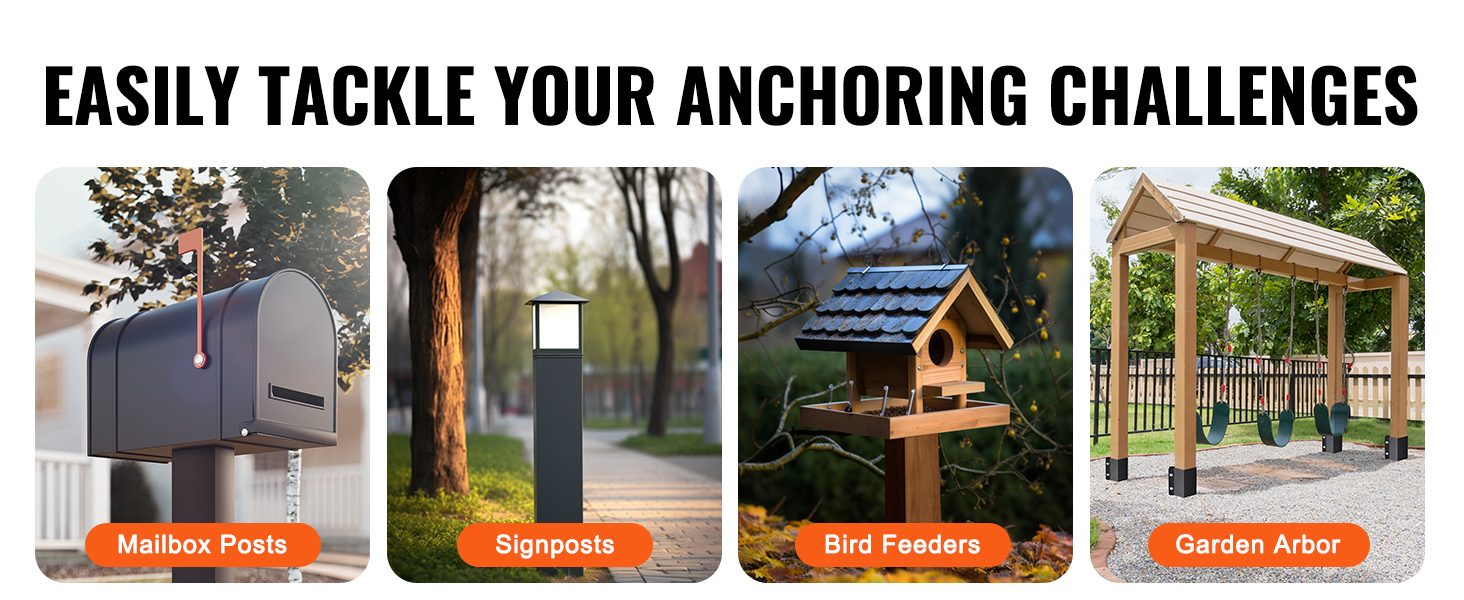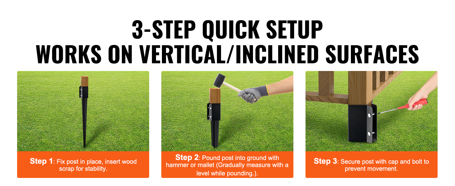 Inštalácia je jednoduchá - nie je potrebný žiadny výkop ani cement. Umiestnite hrot, pridajte drevený blok a zatĺkajte. Po niekoľkých úderoch skontrolujte, či je hrot vyrovnaný, úplne ho zatlačte do zeme a vymeňte ho za plotový stĺpik.