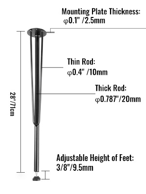 Výška nohy stola je 28", hrúbka hornej dosky je 0,1 palca, priemer hrubej tyče je 0,787 cm a trojtaktná nosná konštrukcia je stabilná a odolná.