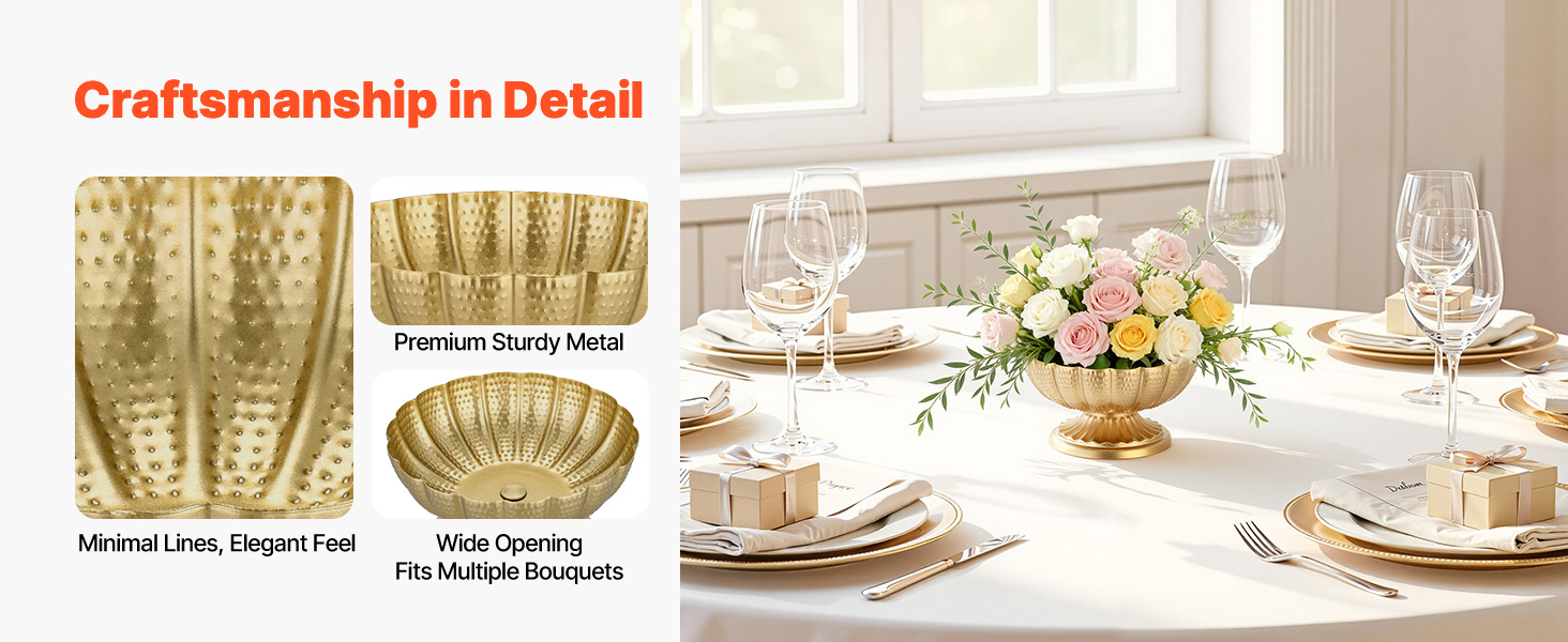 Táto kovová svadobná váza je vyrobená z vysoko kvalitného kovu s rafinovanými detailmi a vyznačuje sa stabilnou, vyváženou konštrukciou a elegantným textúrovaným povrchom, ktorý zdokonaľuje celkový vzhľad stola.