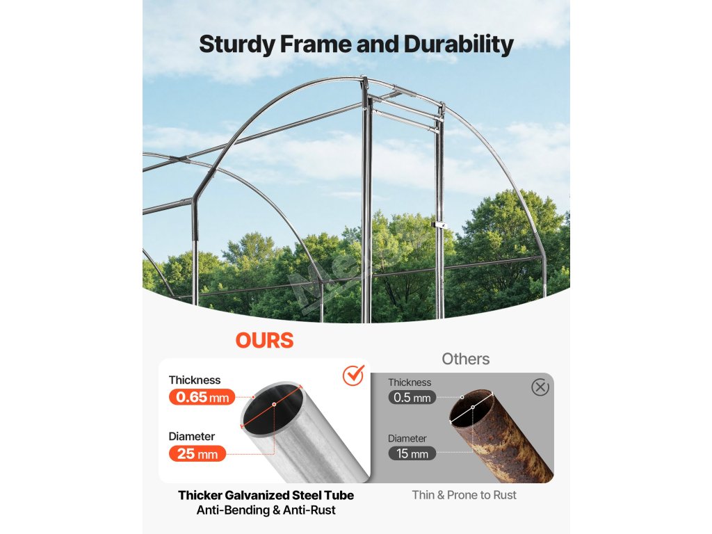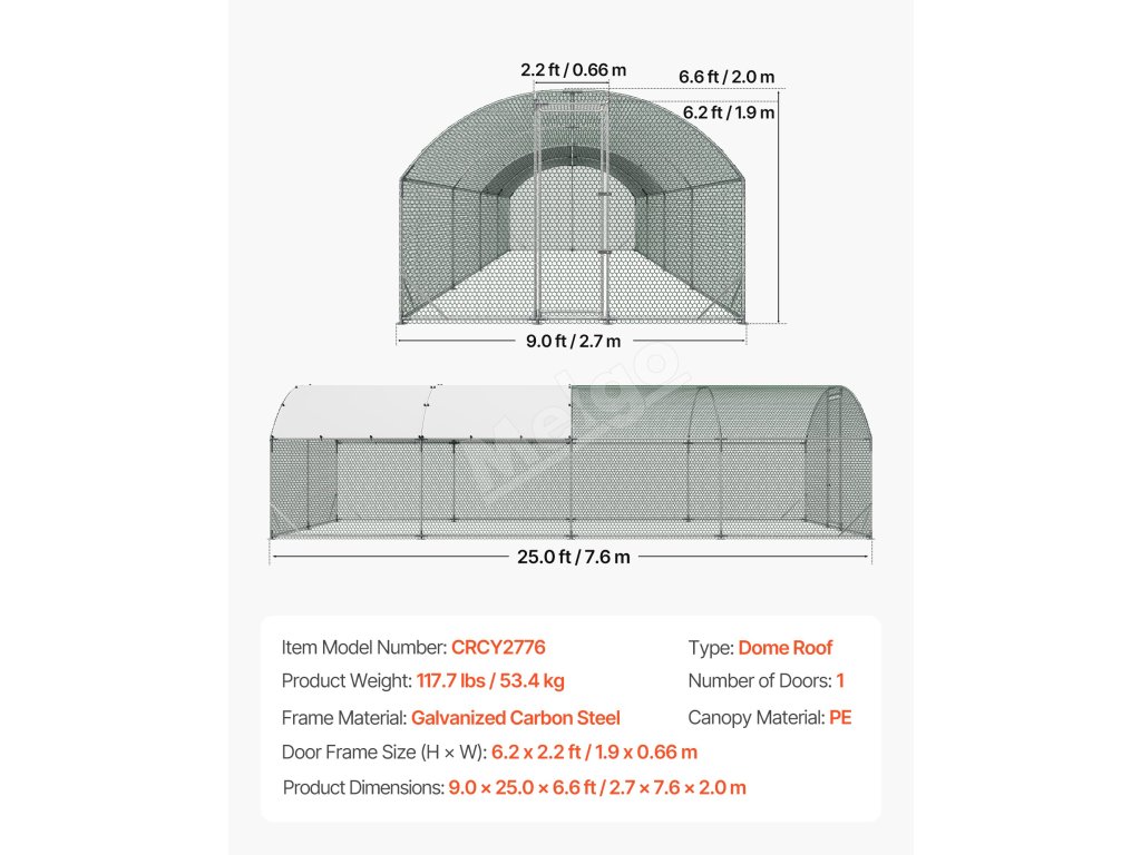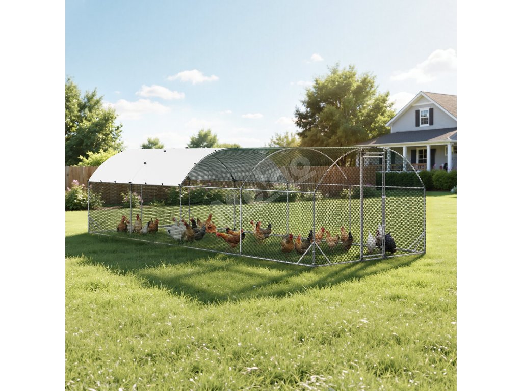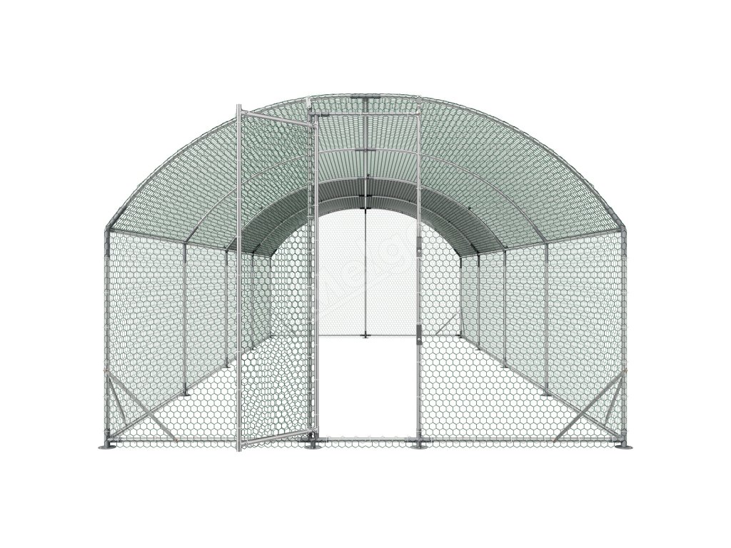 Kovový kurník s vchádzacím výbehom 2.7×7.6×2 m, vodotesný, pevný rám