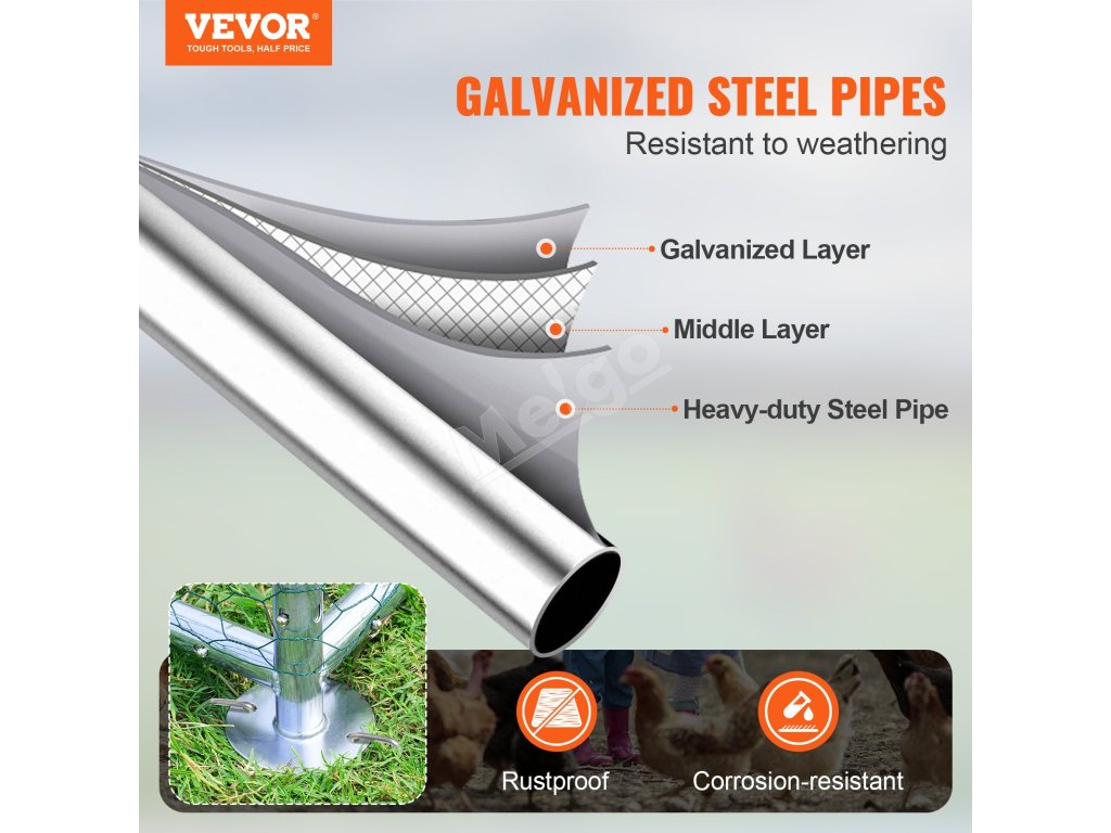 Vďaka 1" hrubým oceľovým rúram a šesťhrannému ochrannému pletivu ponúka tento pochôdzny výbeh pre kurčatá robustnú oporu a ochranu, čím zabezpečuje hydine voľný pohyb v bezpečnom prostredí.