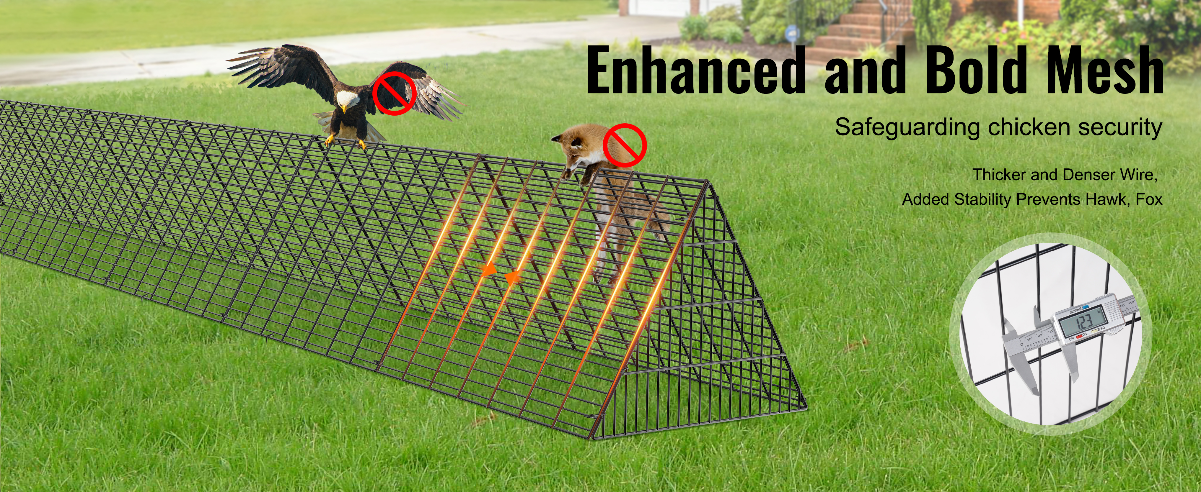 Husté a vystužené mobilné výbehy pre kurčatá zvyšujú stabilitu a zabraňujú vstupu predátorov, ako sú psy, kojoti, jastraby a líšky, čím zabezpečujú bezpečnosť vašej hydiny.