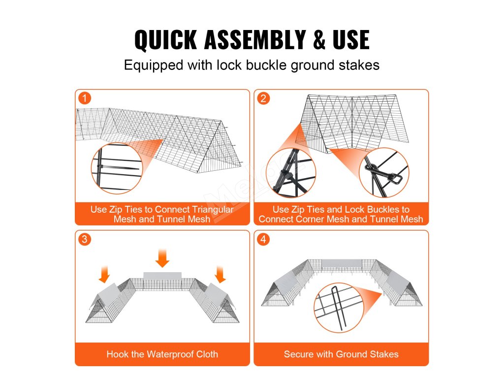 Na rýchlu demontáž stačí odpojiť zemné kolíky, úväzy a zámky, čo uľahčuje premiestňovanie tunela s výbehom pre kurčatá. Upravte jeho polohu a orientáciu podľa ročného obdobia alebo potrieb vašej hydiny, čím bude flexibilnejší a pohodlnejší.