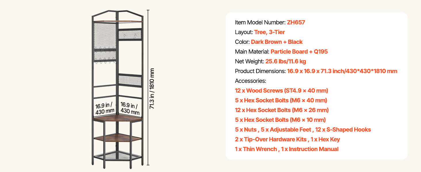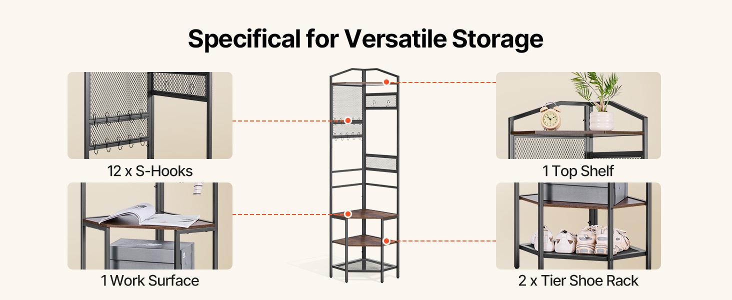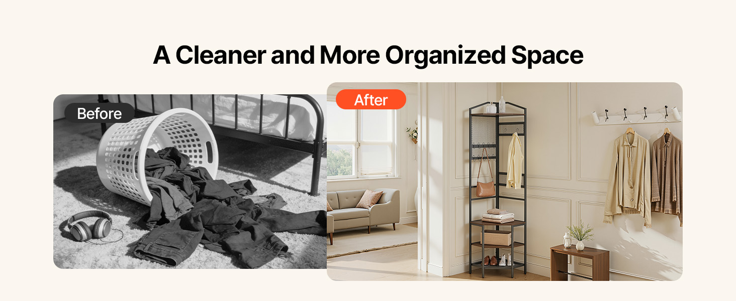 Vďaka viacerým úrovňam a univerzálnemu usporiadaniu úložného priestoru vám rohový vešiak pomôže lepšie využiť priestor a efektívnejšie usporiadať svoje veci.