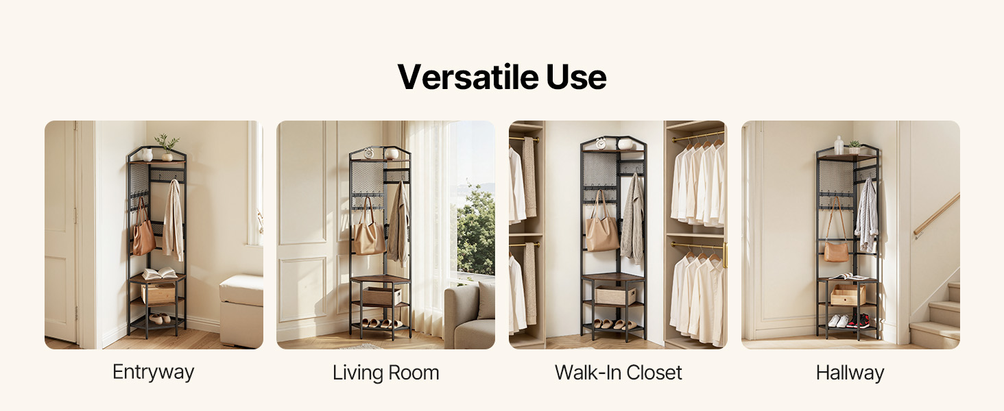Čistý, jednoduchý vzhľad umožňuje, aby sa tento rohový vešiak na topánky a kabáty dokonale hodil k rôznym štýlom interiéru, vďaka čomu je vhodný do vstupných priestorov, obývacích izieb, spální a chodieb.