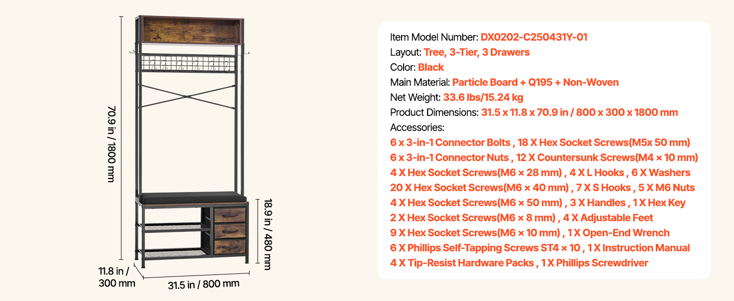 Stojací vešiak, lavica, 3 zásuvky, knižná a drôtená polica, 1800 mm
