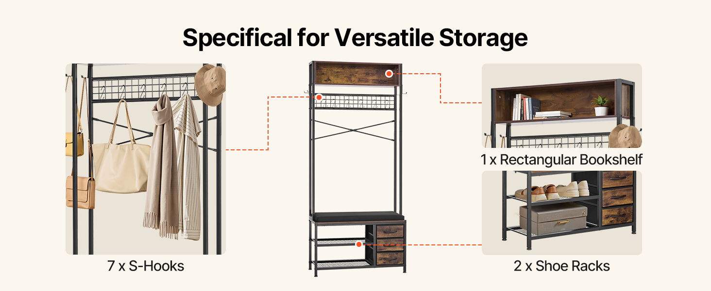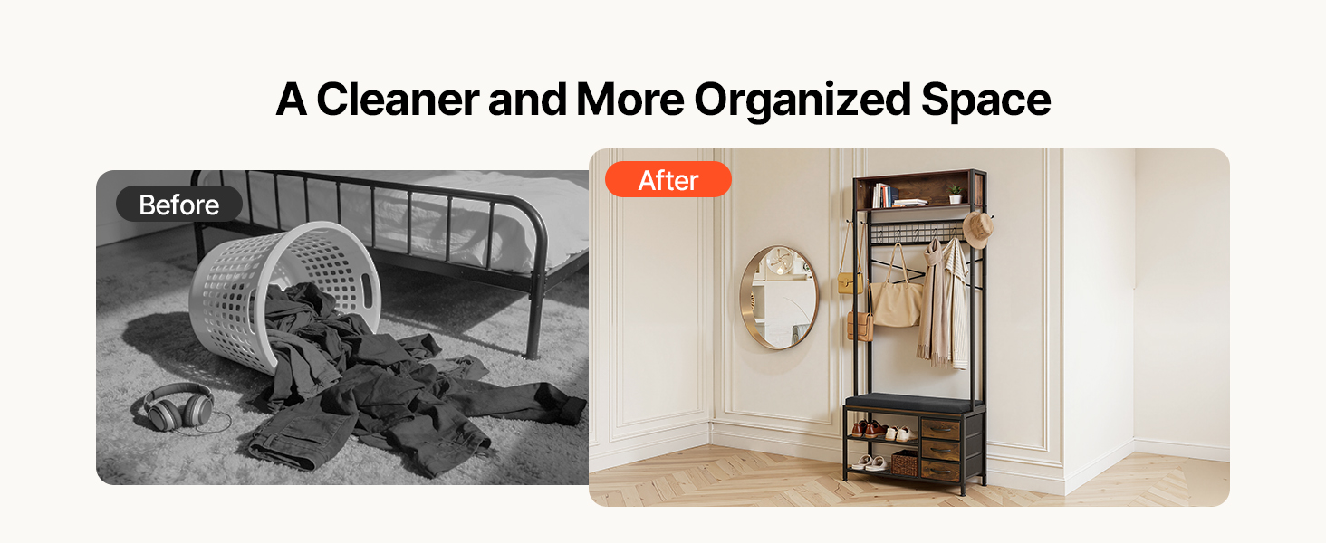 Vďaka viacerým úrovňam a univerzálnym možnostiam usporiadania úložného priestoru vám náš vešiak pomôže lepšie využiť priestor a efektívnejšie usporiadať vaše veci.