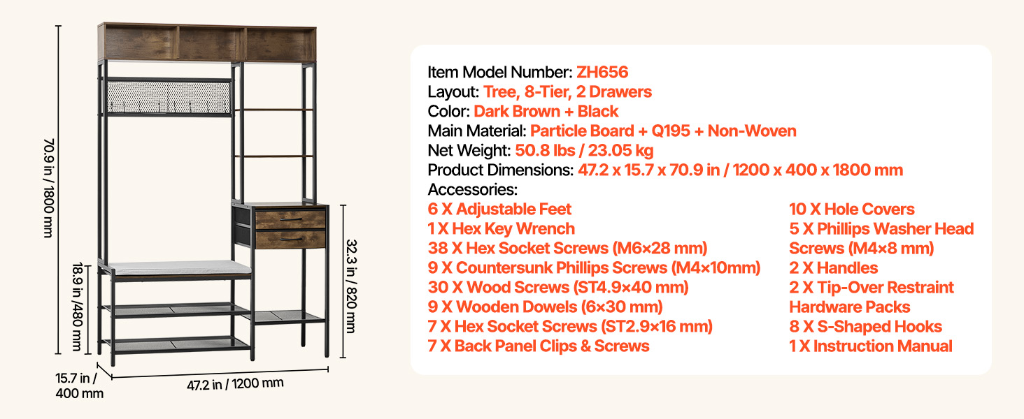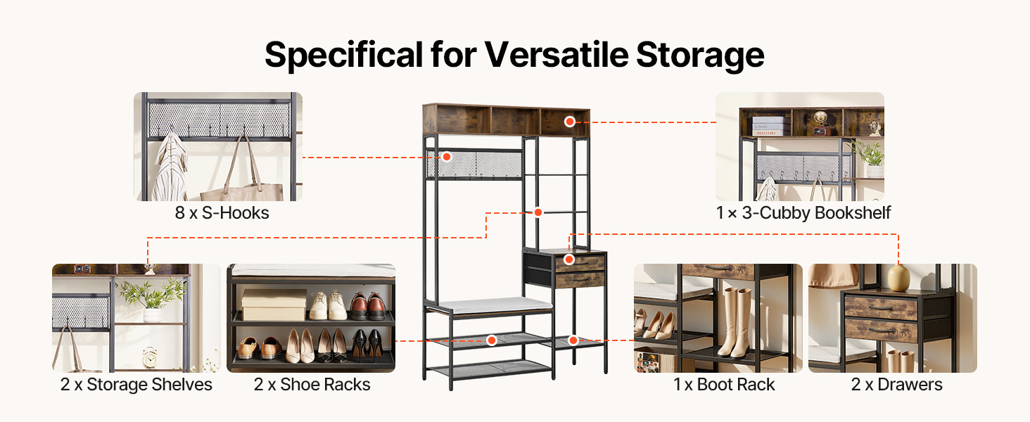 Vešiak na topánky a kabáty udržiava často používané oblečenie, topánky, tašky a každodenné predmety na jednom mieste, aby boli rýchlo dostupné, čím pomáha znížiť neporiadok a udržiavať uprataný obytný priestor.
