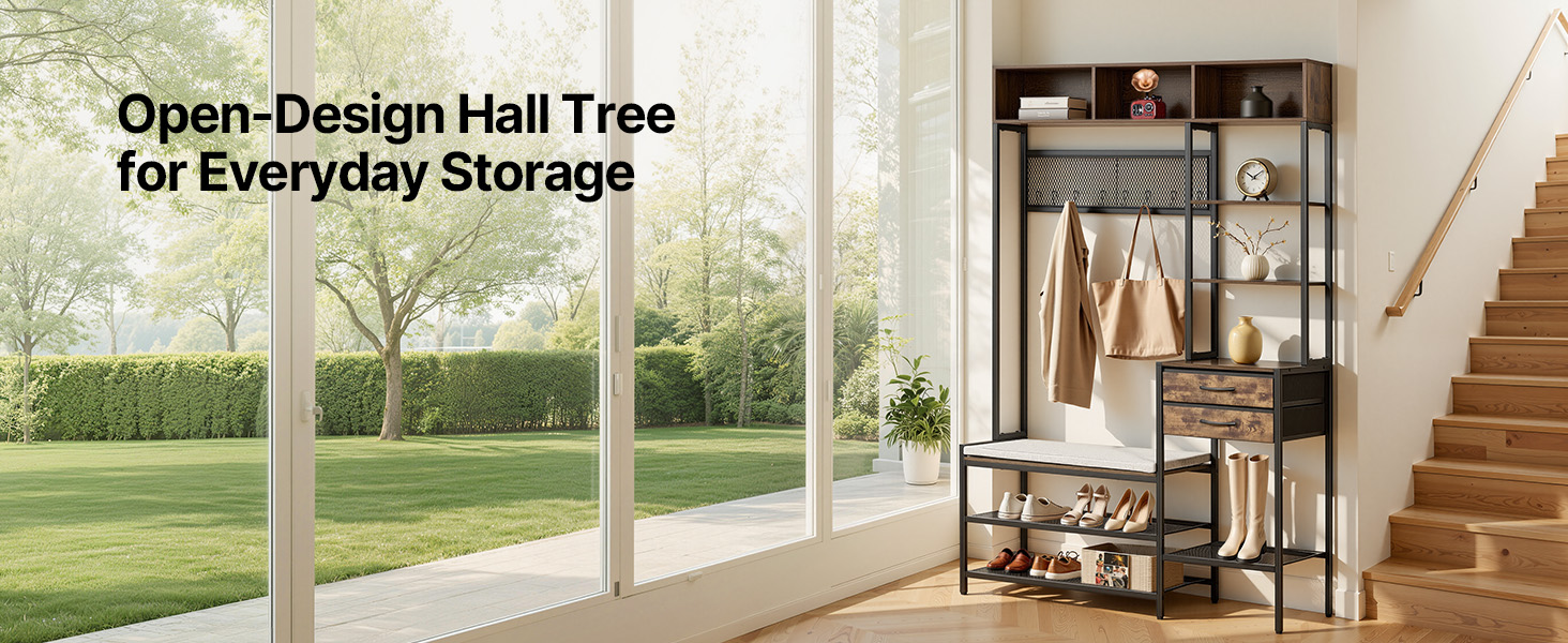 Tento vešiak na kabáty, navrhnutý tak, aby spájal vešiak, úložný priestor na topánky a otvorené police, vytvára inteligentný vertikálny úložný priestor pre čistejší a priestrannejší domov.