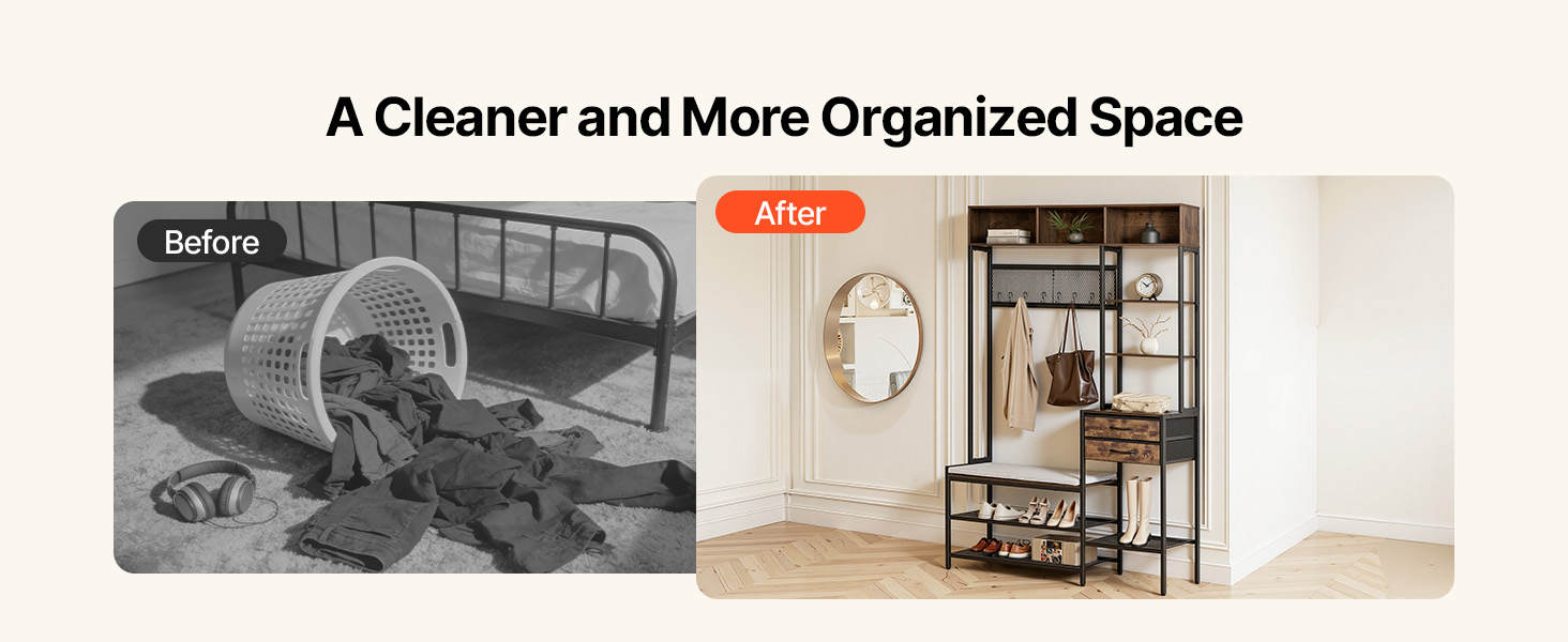 Vďaka viacerým úrovňam a univerzálnemu usporiadaniu úložného priestoru vám náš vešiak pomôže lepšie využiť priestor a efektívnejšie usporiadať vaše veci.