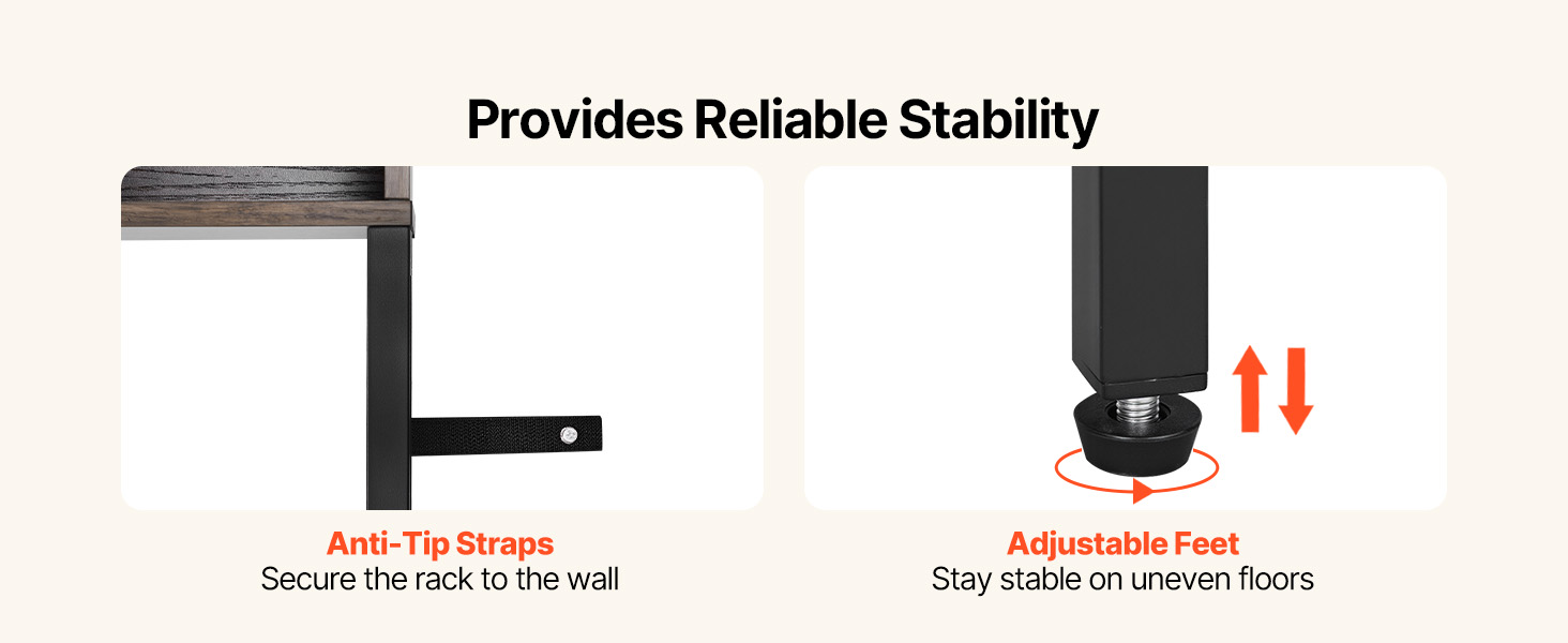 Nástenné protisklzové popruhy a nastaviteľné nožičky tohto vešiaka na kabáty a topánky spoločne zvyšujú stabilitu a pomáhajú udržiavať bezpečný a pohodlný domáci priestor pre celú rodinu.
