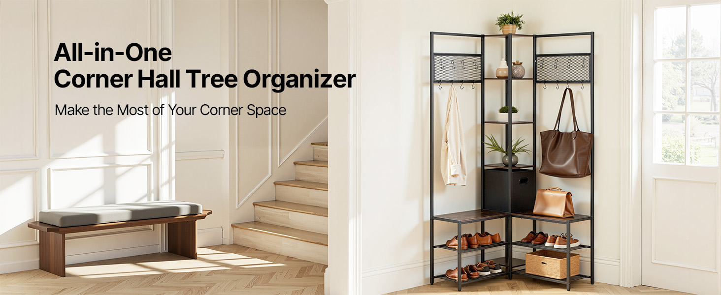 Vďaka viacerým úrovňam a univerzálnemu usporiadaniu úložného priestoru vám rohový vešiak pomôže lepšie využiť priestor a efektívnejšie usporiadať svoje veci.