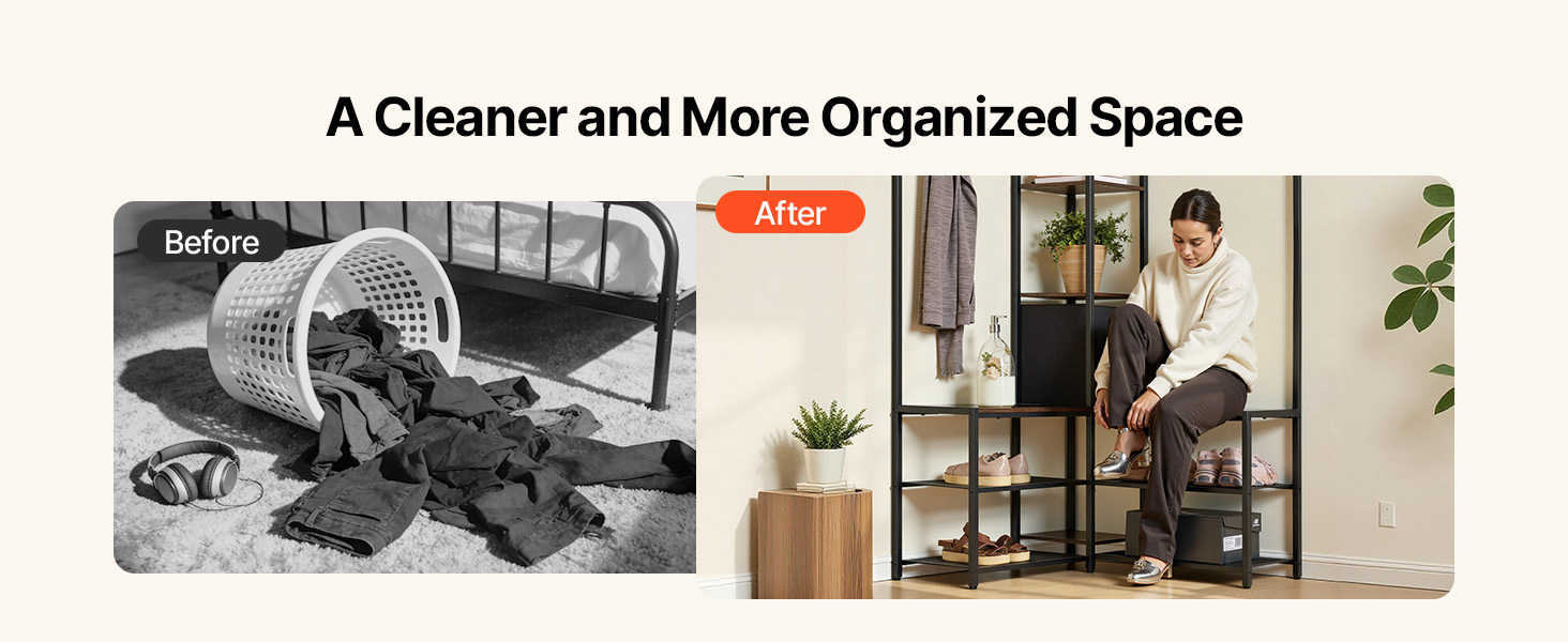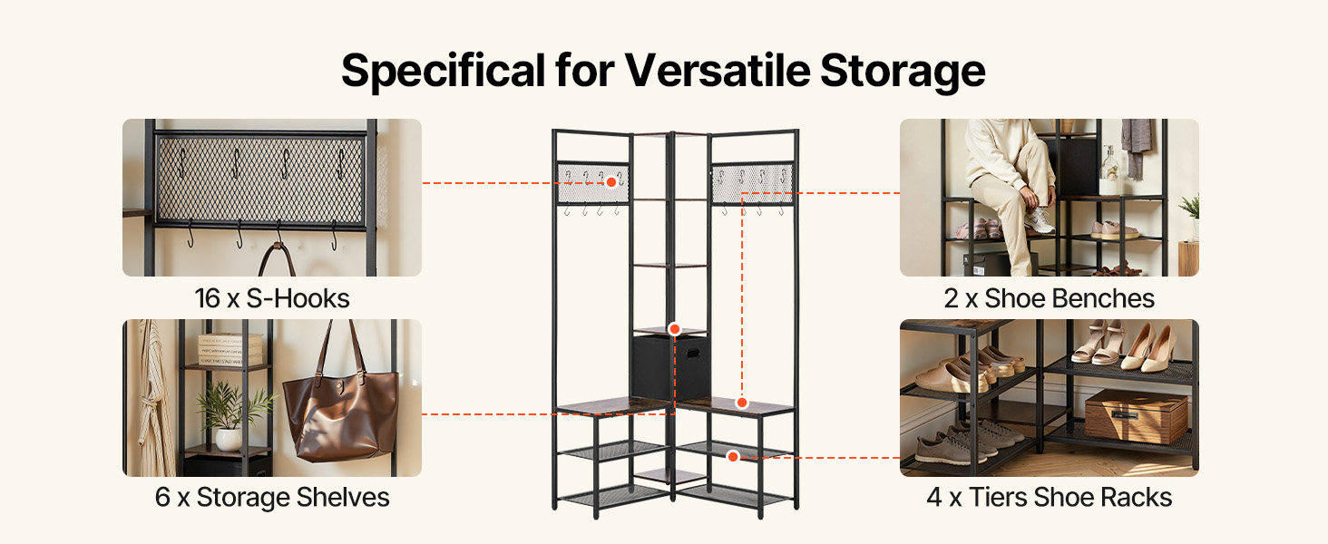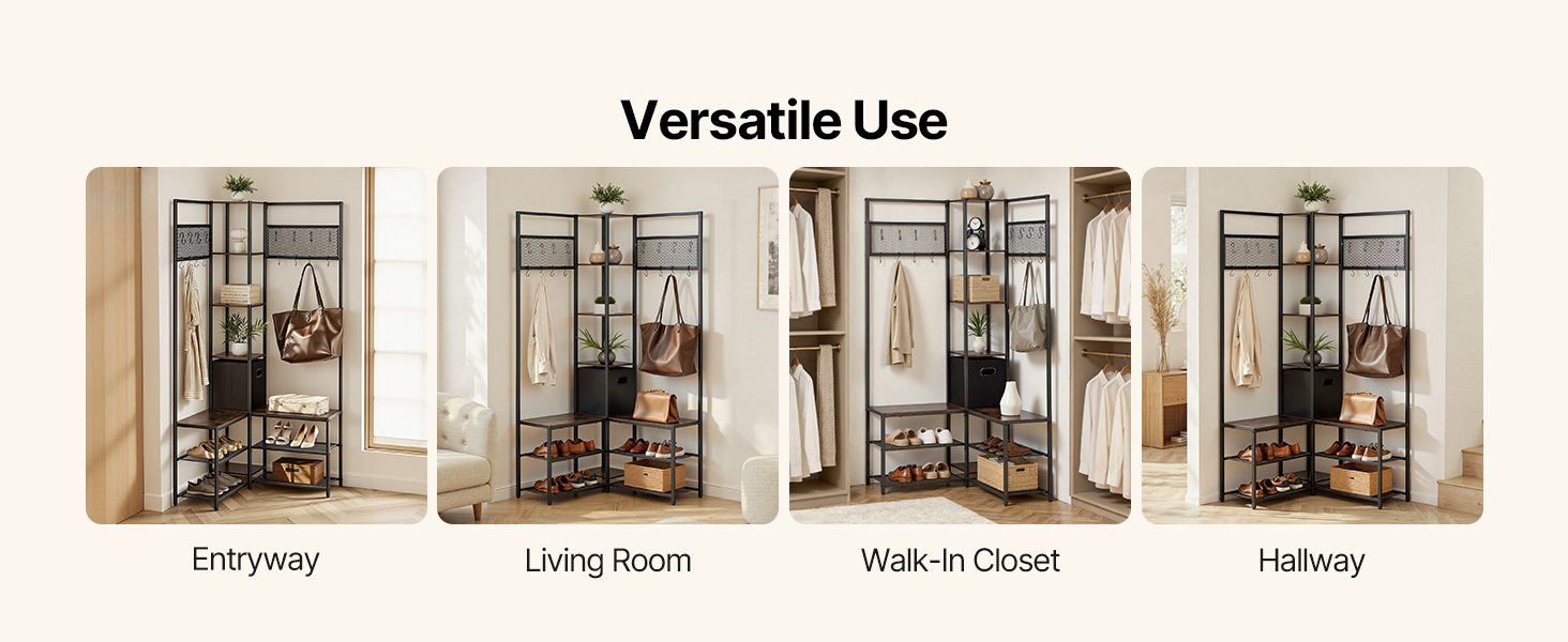 Čistý, jednoduchý vzhľad umožňuje, aby sa tento rohový vešiak na topánky a kabáty dokonale hodil k rôznym štýlom interiéru, vďaka čomu je vhodný do vstupných priestorov, obývacích izieb, spální a chodieb.
