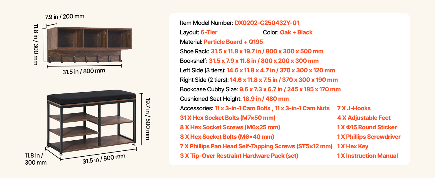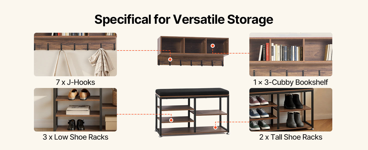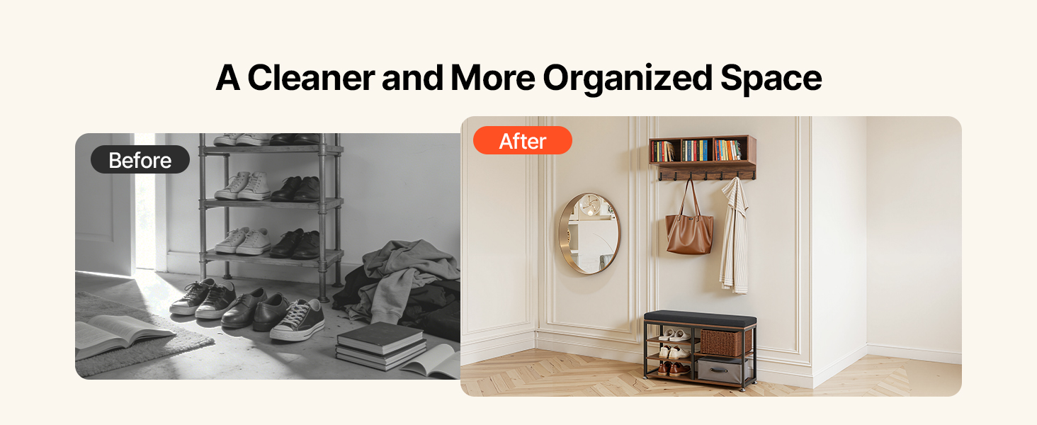 Vešiak na topánky a kabáty udrží často používané oblečenie, topánky, tašky a každodenné predmety na jednom mieste pre rýchly prístup, čím pomáha znížiť neporiadok a udržiavať uprataný obytný priestor.